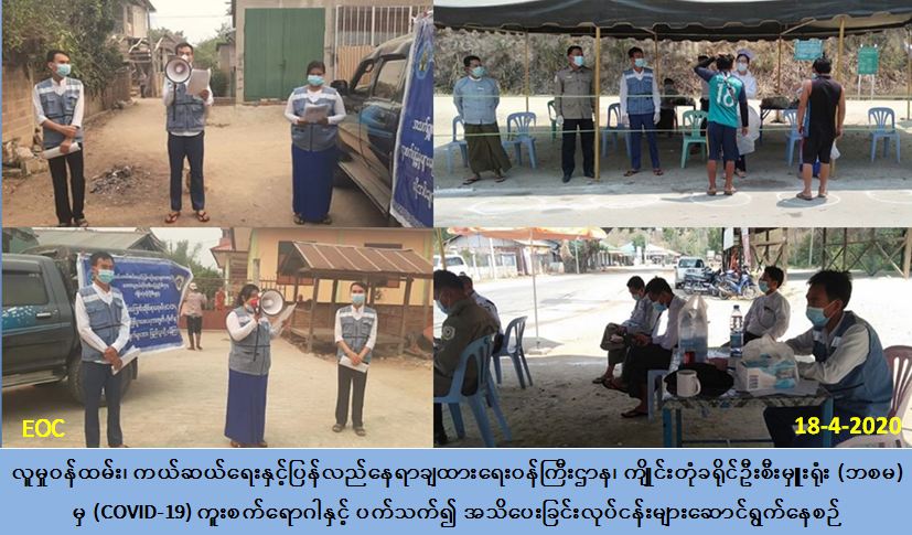 လူမှုဝန်ထမ်း၊ ကယ်ဆယ်ရေးနှင့် ပြန်လည်နေရာချထားရေးဝန်ကြီးဌာန၊ ဘေးအန္တရာယ် ဆိုင်ရာစီမံခန့်ခွဲမှုဦးစီးဌာန၊ ကျိုင်းတုံခရိုင်ဦးစီးမှူးရုံး မှ တာ၀န်ရှိသူများသည် (၁၈-၄-၂၀၂၀) ရက်နေ့တွင် မြို့နယ်အထွေထွေအုပ်ချုပ်ရေးဦးစီးဌာန၊ မြို့နယ်ပြည်သူ့ကျန်းမာရေးဦးစီးဌာန၊ မြို့နယ်ကြက်ခြေနီအသင်းတို့နှင့် ပူပေါင်း၍ကျိုင်းတုံ၊ တာချီလိတ်၊ နောင်နွန်းစုပေါင်းဂိတ်၌ ကျိုင်းတုံမြို့တွင်းသို့အ၀င် /အထွက်ယာဉ် လိုင်းများတွင်စီးနှင်း လိုက်ပါသော ခရီးသည်များ အား ကျန်းမာရေးစစ်ဆေးခြင်း၊ မှတ်တမ်းကောက်ယူခြင်းနှင့် ကျိုင်းတုံမြို့၀မ်ဆောင်ကျေးရွာ အုပ်စု၊ ၀မ်ဆောင်ကျေးရွာနှင့် နောင်အော့ကျေးရွာတို့တွင် လတ်တလော နိုင်ငံအသီးသီးတွင် ကူးစက်ပြန့်ပွား လျက်ရှိသောCOVID -19 ကူးစက် ရောဂါကြိုတင်ကာကွယ် ထိန်းချုပ်နိုင် ရေးအတွက် COVID-19 ရောဂါ ကူးစက်ပြန့်နှံ့မှုမဖြစ်ပွားစေရန် သိရှိလိုက်နာဆောင်ရွက် ရမည့် အချက်များကို အသိပညာပေးဟောပြောခဲ့ပါကြောင်းသတင်းရရှိပါသည်။
