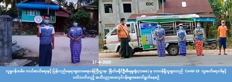 လူမှုဝန်ထမ်း၊ ကယ်ဆယ်ရေးနှင့် ပြန်လည်နေရာချထားရေးဝန်ကြီးဌာန၊ ဘေးအန္တရာယ်ဆိုင်ရာ စီမံ ခန့်ခွဲမှုဦးစီးဌာန၊ မြိတ်ခရိုင်ဦးစီးမှူးရုံးမှ တာဝန်ရှိသူများသည် ဂဝေသီလူမှုကူညီရေးအသင်းနှင့် ပူးပေါင်း၍ (၁၇-၄-၂၀၂၀)နေ့ မြိတ်မြို့နယ်၊ စန္ဒဝတ်ကျေးရွာအုပ်စု၊ ရွှေပေးကျေးရွာ၌ COVID -19 ရောဂါကူးစက် ပြန့်ပွားမှုမရှိစေရေး အသိပညာပေးဆော်သြခြင်း၊ ဗီနိုင်းပိုစတာကပ်ခြင်းတို့ကို ဆောင်ရွက်ခဲ့ကြောင်း သိရှိရပါသည်။