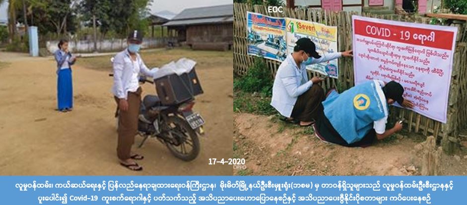 လူမှုဝန်ထမ်း၊ ကယ်ဆယ်ရေးနှင့်ပြန်လည်နေရာချထားရေးဝန်ကြီးဌာန၊ ဘေးအန္တရာယ်ဆိုင်ရာ စီမံခန့်ခွဲမှု ဦးစီးဌာန၊ မိုးမိတ်မြို့နယ်ဦးစီးမှူးရုံးမှ တာဝန်ရှိသူများသည် လူမှုဝန်ထမ်းဦးစီးဌာနတို့နှင့် ပူးပေါင်း၍ (၁၇-၄-၂၀၂၀) ရက်နေ့၊ (၁၅:၀၀)နာရီမှ(၁၈:၀၀)နာရီအထိ မိုးမိတ်မြို့နယ်၊ အထင်မန်ကျည်းပင်ကျေးရွာ၊ မန်ဖွယ်(ရွာသစ်၊ရွာဟောင်း) ကျေးရွာနှင့် လယ်ကြီးကျေးရွာတို့တွင် အသက်ရှူလမ်းကြောင်းဆိုင်ရာ ရောဂါ (COVID-19) ကူးစက်ပျံ့နှံ့မှုများမဖြစ်စေရေးအတွက် လိုက်နာဆောင်ရွက်ရန်လိုအပ်ချက်များအား ပြည်သူသို့ ပန်ကြားခြင်းအစီအစဉ်ကို ဆောင်ရွက်ခြင်း၊ လက်ကမ်းစာစောင်များမျှဝေခြင်းနှင့် အသိ ပညာပေး ဗွီနိုင်းပိုစတာ ဆိုင်းဘုတ်များ ကပ်ခြင်းလုပ်ငန်းများဆောင်ရွက်ခဲ့ကြောင်း သိရှိရပါသည်။