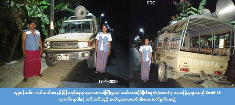 လူမှုဝန်ထမ်း၊ ကယ်ဆယ်ရေးနှင့် ပြန်လည်နေရာချထားရေးဝန်ကြီးဌာန၊ ဘေးအန္တရာယ်ဆိုင်ရာ စီမံခန့်ခွဲ မှုဦးစီးဌာန၊ ဟင်္သာတခရိုင်ဦးစီးမှူးရုံးမှ တာဝန်ရှိသူများသည် (၁၇-၄-၂၀၂၀) ရက်နေ့ (၂၀:၀၀) နာရီ အချိန်မှစတင်ပြီး ဟင်္သာတမြို့နယ်၊ ဒူးယားမြို့ အမှတ်(၁)ရပ်ကွက်၊ အမှတ် (၂)ရပ်ကွက်၊ အမှတ်(၃) ရပ်ကွက်နှင့် ညောင်ကုန်းရပ်ကွက်အတွင်းရှိ လမ်းများတို့တွင်လှည့်လည်၍ လတ်တလော ဖြစ်ပွားလျက် ရှိသော COVID -19 ကူးစက်ရောဂါနှင့်ပတ်သက်ပြီး ဆောင်ရန်၊ ရှောင်ရန်တို့ကို ရပ်ကွက်နေပြည်သူ တို့ အား အသိပညာပေးဟောပြောဆောင်ရွက်ခဲ့ကြောင်း သိရှိရပါသည်။