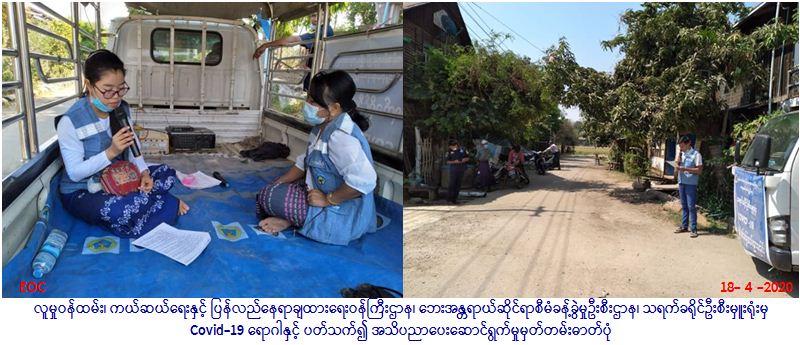 လူမှုဝန်ထမ်း၊ ကယ်ဆယ်ရေးနှင့် ပြန်လည်နေရာချထားရေးဝန်ကြီးဌာန၊ ဘေးအန္တရာယ်ဆိုင်ရာစီမံခန့်ခွဲမှုဦးစီးဌာန၊ သရက် ခရိုင်ဦးစီးမှူးရုံးမှ တာဝန်ရှိသူများသည် မြတ်ပါရမီပရဟိတအသင်းတို့နှင့်ပူးပေါင်း၍ (၁၈.၄.၂၀၂၀)ရက်နေ့တွင် ကံမမြို့နယ် အတွင်းရှိ ပဇင်းနိမ့်ကျေးရွာ၊ အုတ်ပုံကျေးရွာ၊ မင်းတဲကျေးရွာ၊ အုပ်ရှစ်ကုန်းကျေးရွာနှင့် သစ်ငုတ္တထောင်ကျေးရွာတို့တွင် COVID-19 ကူးစက်ရောဂါနှင့်ပတ်သက်၍ အသိပညာပေး ဆောင်ရွက်ခဲ့ပါကြောင်း ဆောင်ရွက်ခဲ့ပါကြောင်း သတင်းရရှိသည်။