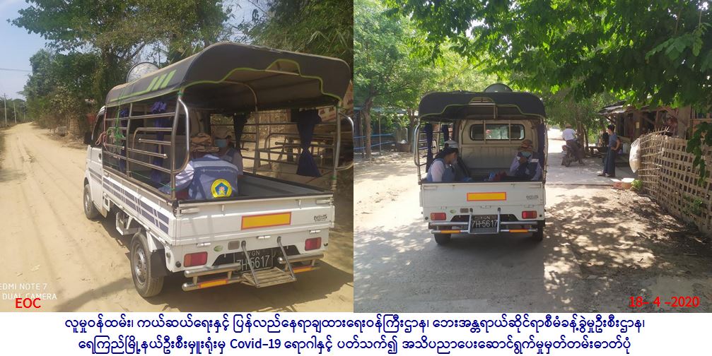 လူမှုဝန်ထမ်း၊ ကယ်ဆယ်ရေးနှင့် ပြန်လည်နေရာချထားရေးဝန်ကြီးဌာန၊ ဘေးအန္တရာယ်ဆိုင်ရာစီမံခန့်ခွဲမှုဦးစီးဌာန၊ ရေကြည် မြို့နယ်ဦးစီးမှူးရုံးမှ တာဝန်ရှိသူများသည် (၁၈.၄.၂၀၂၀)ရက်နေ့တွင် ရေကြည်မြို့နယ် အသုတ်မြို့၊ဒေါင့်ကြီးရိုးမဒေါ့ကျေးရွာ အုပ်စု၊ ကွမ်းခြံကုန်းကျေးရွာအုပ်စုတွင် (၀၈:၀၀)နာရီမှ (၀၉:၃၀)နာရီအထိလည်းကောင်း၊ ငှက်ပျော်တောကွင်းကျေးရွာတွင် (၀၉:၃၀)နာရီမှ (၁၁:၀၀)နာရီအထိလည်းကောင်း၊ ပျဉ်းကတိုးကုန်းကျေးရွာတွင် (၁၁:၀၀)နာရီမှ (၁၂:၀၀)နာရီအထိ လည်းကောင်း၊ ထန်းတောကြီးကျွေးရွာတွင် (၁၃:၀၀) နာရီမှ (၁၄:၃၀)နာရီအထိလည်းကောင်း၊ တပ်မဆုတ်ချောင်ကျေးရွာတွင် (၁၄:၃၀)နာရီမှ (၁၆:၀၀)နာရီအထိ လက်တလောနိုင်ငံအသီးသီးတွင် ကူးစက်ပြန့်ပွားလျက်ရှိသော COVID-19 ကူးစက် ရောဂါနှင့်ပတ်သက်ပြီး ဆောင်ရန်/ရှောင်ရန်များကို ကျေးရွာ/ရပ်ကွက်နေပြည်သူတို့အား အသိပညာပေးဟောပြောဆောင်ရွက် ခဲ့ပါကြောင်း သတင်းရရှိပါသည်။