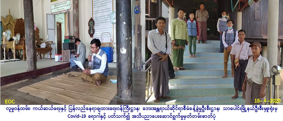 လူမှုဝန်ထမ်း၊ ကယ်ဆယ်ရေးနှင့် ပြန်လည်နေရာချထားရေးဝန်ကြီးဌာန၊ ဘေးအန္တရာယ်ဆိုင်ရာစီမံခန့်ခွဲမှုဦးစီးဌာန၊ သာပေါင်း မြို့နယ်ဦးစီးမှူးရုံးမှ တာဝန်ရှိသူများသည် ပုသိမ်ခရိုင်၊ သာပေါင်းမြို့နယ်၊ ရွှေညောင်ပင်ကျေးရွာ၌ ကျေးရွာအုပ်စုအုပ်ချုပ်ရေးမှူး၊ ရပ်မိရပ်ဖများ၊ ကျေးရွာရှိတာ၀န်ရှိသူများနှင့်အတူ (၁၈-၄-၂၀၂၀) ရက်နေ့၌ (၁၀:၀၀)နာရီအချိန်တွင် လက်တလောနိုင်ငံ အသီး သီးတွင် ကူးစက်ပြန့်ပွားလျက်ရှိသော COVID-19 ကူးစက် ရောဂါနှင့်ပတ်သက်ပြီး ဆောင်ရန်/ရှောင်ရန်များကို ကျေးရွာ/ရပ်ကွက် နေပြည်သူတို့အား အသိပညာပေးဟောပြောဆောင်ရွက်ခဲ့ပါကြောင်း သတင်းရရှိပါသည်။