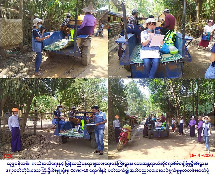 လူမှုဝန်ထမ်း၊ ကယ်ဆယ်ရေးနှင့် ပြန်လည်နေရာချထားရေးဝန်ကြီးဌာန၊ ဘေးအန္တရာယ်ဆိုင်ရာစီမံခန့်ခွဲမှုဦးစီးဌာန၊ ဧရာဝတီ တိုင်းဒေသကြီးဦးစီးမှူးရုံးမှ တာဝန်ရှိသူများသည် (၁၈-၄-၂၀၂၀)ရက်နေ့၊ (၁၀:၀၀)နာရီအချိန်မှစ၍ ပုသိမ်ခရိုင်၊ ငပုတောမြို့နယ်၊ ဟင်းအိုးချောင်းကျေးရွာအုပ်စု၊ ဟင်းအိုးချောင်းကျေးရွာ၊ သရက်ကုန်းကျေးရွာနှင့် ရေငံကျေးရွာတို့၌ လတ်တလောနိုင်ငံ အသီး သီးတွင် ကူးစက်ပြန့်ပွားလျက်ရှိသော COVID-19 ကူးစက်ရောဂါနှင့်ပတ်သက်၍ ရပ်ကွက်နေပြည်သူများအား အသိပညာပေး ဟောပြောခြင်းများ ဆောင်ရွက်ခဲ့ပါကြောင်း သတင်းရရှိပါသည်။