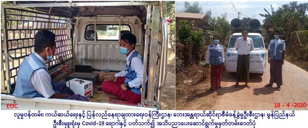 လူမှုဝန်ထမ်း၊ ကယ်ဆယ်ရေးနှင့် ပြန်လည်နေရာချထားရေးဝန်ကြီးဌာန၊ ဘေးအန္တရာယ်ဆိုင်ရာစီမံခန့်ခွဲမှုဦးစီးဌာန၊ မွန်ပြည်နယ် ဦးစီးမှူးရုံးမှ တာဝန်ရှိသူများသည် (၁၈.၄.၂၀၂၀) ရက်နေ့တွင် မွန်ပြည်နယ်၊ မော်လမြိုင်မြို့နယ်အတွင်းရှိ၊ ဂွေးကုန်းရပ်ကွက်နှင့် နောင်ခရီရပ်ကွက်တို့၌ (Covid-19) လတ်တလော အသက်ရှူ လမ်းကြောင်းဆိုင်ရာရောဂါ ကြိုတင်ကာကွယ်ထိန်းချုပ်နိုင်ရန် အများပြည်သူသို့ အသိပညာပေးခြင်းများ ဆောင်ရွက်ခဲ့ပါကြောင်း သတင်းရရှိပါသည်။
