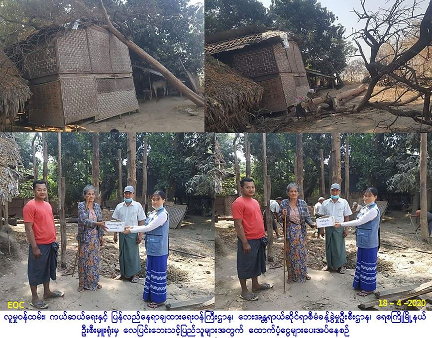 လူမှုဝန်ထမ်း၊ ကယ်ဆယ်ရေးနှင့် ပြန်လည်နေရာချထားရေးဝန်ကြီးဌာန၊ ဘေးအန္တရာယ်ဆိုင်ရာစီမံခန့်ခွဲမှုဉီးစီးဌာန၊ ရေစကြို မြို့နယ်ဦးစီးမှူးရုံးမှ တာဝန်ရှိသူများသည် ရေစကြိုမြို့နယ်၊ နန်းဦးကျေးရွာအုပ်စု၊ သဲအင်းကျေးရွာတွင် (၁၆-၄-၂၀၂၀) ရက်နေ့၊ (၂၀:ဝ၀) နာရီအချိန်မှ (၂၁:၀၀) နာရီ အချိန်ထိလေပြင်းတိုက်ခတ်မှုကြောင့် သွပ်မိုး၊ ထရံကာ၊ ဝါးကြမ်းခင်း(၂)ထပ်နေအိမ်ပေါ်သို့ သီးပင်လဲကျခဲ့ရာ လူနေအိမ်(၁)လုံး၊ အိမ်ထောင်စု(၁)စု၊ လူဦးရေ(၄)ဦးတို့အတွက် အိမ်ဆောက်ပစ္စည်းဖိုး(၈၀၀၀ဝ/-)၊ ဆန်ရိက္ခာဖိုး(၈၄၀ဝ/-)၊ စုစုပေါင်းကျပ်(၈၈၄၀ဝ/-)အား (၁၈-၄-၂၀၂၀)ရက်နေ့၊ (၉:၀၀)နာရီအချိန်တွင် ကျေးရွာအုပ်ချုပ်ရေးမှူး နှင့်အတူ ဘေးသင့်ပြည်သူ လက်ဝယ်အရောက် ကွင်းဆင်းထောက်ပံ့ပေးအပ်ခဲ့ကြောင်း သတင်းပေးရရှိပါသည်။
