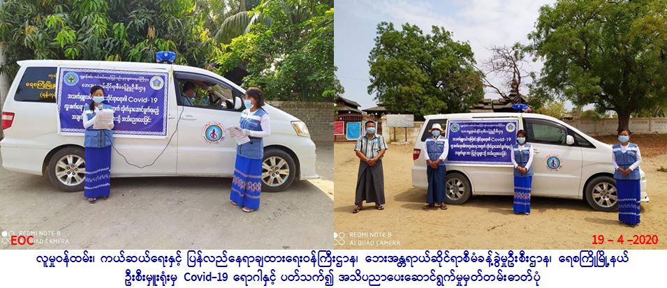 လူမှုဝန်ထမ်း၊ ကယ်ဆယ်ရေးနှင့် ပြန်လည်နေရာချထားရေးဝန်ကြီးဌာန၊ ဘေးအန္တရာယ်ဆိုင်ရာစီမံခန့်ခွဲမှုဉီးစီးဌာန၊ ရေစကြို မြို့နယ်ဦးစီးမှူးရုံးမှ တာဝန်ရှိသူများသည် (၁၉.၄.၂၀၂၀) ရက်နေ့တွင် (၀၈:၀၀)နာရီမှစတင်၍ (၁၃:၀၀)အချိန်အထိ ရေစကြိုမြို့နယ်၊ ပညှင်းကျေးရွာ၊ ကြီးကံကျေးရွာ၊ သက်ရွာကျေးရွာ၊ တောင်အိုကျေးရွာ၊ ပခန်းကြီးကျေးရွာနှင့် ဆင်ချောင်းကျေးရွာများသို့ COVID-19ရောဂါကူးစက်ပျံ့နှံ့မှုများ မဖြစ်ပွားစေရန်အတွက် သိရှိလိုက်နာဆောင်ရွက်ရန်များကို လော်စပီကာဖြင့် အသိပေး ကြေညာဆောင်ရွက်ခြင်းပြုလုပ်ခဲ့ပါကြောင်း သတင်းပေးရရှိပါသည်။