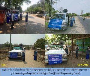 လူမှု၀န်ထမ်း၊ ကယ်ဆယ်ရေးနှင့်ပြန်လည်နေရာချထားရေး၀န်ကြီးဌာန၊ ဘေးအန္တရာယ် ဆိုင်ရာစီမံခန့်ခွဲမှုဦးစီးဌာန၊ မန္တလေးတိုင်းဒေသကြီးဦးစီးမှူးရုံးမှ တာ၀န်ရှိသူများသည် (၁၅-၄-၂၀၂၀) ရက်နေ့တွင် စဉ့်ကူးမြို့နယ်အတွင်းရှိ ရပ်ကွက်၊ ကျေးရွာအုပ်စုများတွင် COVID-19 ကူးစက်ရောဂါနှင့် ပတ်သက်သည့် စောင်ရန်/ရှောင်ရန်များကို အသံချဲ့စက်များဖြင့် အသိ ပညာပေး လုပ်ငန်းများအား ဆောင်ရွက်ခဲ့ပါကြောင်းသတင်းရရှိပါသည်။