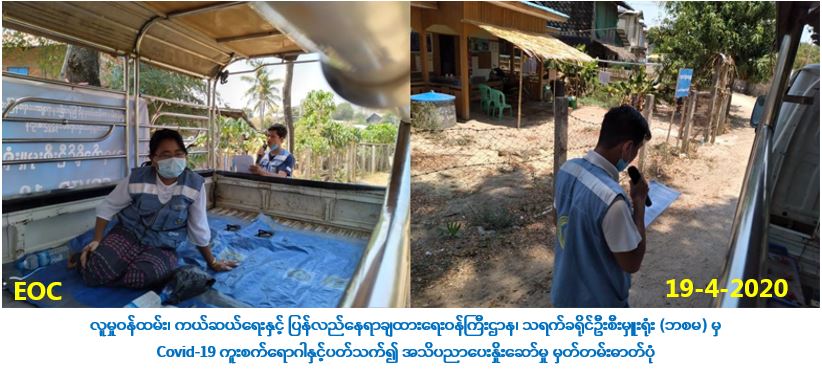 လူမှုဝန်ထမ်း၊ ကယ်ဆယ်ရေးနှင့်ပြန်လည်နေရာချထားရေးဝန်ကြီးဌာန၊ ဘေးအန္တရာယ်ဆိုင်ရာစီမံ ခန့်ခွဲမှုဦးစီးဌာန၊ သရက်ခရိုင်ဦးစီးမှူးရုံးမှ တာဝန်ရှိသူများသည် (၁၉-၄-၂၀၂၀)ရက်နေ့တွင် မြတ်ပါရမီပရဟိတအသင်းတို့နှင့် ပူးပေါင်း၍ ကံမမြို့နယ်အတွင်းရှိ ရေနံ့သာကျေးရွာ၊ စုံကုန်းကျေးရွာ၊ သပြင်ဆောင်ကျေးရွာ၊ စမ်းသပြေကျေးရွာ၊ နတ်မီးတောက်ကျေးရွာနှင့် ထန်းဖြူကျေးရွာတို့တွင် COVID-19 ကူးစက်ရောဂါနှင့်ပတ်သက်၍ အသိပညာပေးဆောင်ရွက်ခဲ့ပါကြောင်း သတင်းရရှိပါသည်။