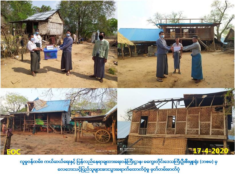 လူမှုဝန်ထမ်း၊ ကယ်ဆယ်ရေးနှင့်ပြန်လည်နေရာချထားရေးဝန်ကြီးဌာန၊ ဘေးအန္တရာယ်ဆိုင်ရာစီမံ ခန့်ခွဲမှုဦးစီးဌာန၊ မကွေးတိုင်းဒေသကြီးဦးစီးမှူးရုံးမှ တာဝန်ရှိသူများသည် မကွေးတိုင်းဒေသကြီး၊ မကွေးမြို့နယ်တွင် (၁၆-၄-၂၀၂၀) ရက်နေ့၊ (၁၆:၀၀) နာရီအချိန်ခန့်တွင် လေပြင်းတိုက်ခတ်မှုဖြစ်ပွားခဲ့ရာ ကျေးရွာအုပ်စု (၁၄) စုရှိ ကျေးရွာပေါင်း(၂၀)ရွာတွင် ပြိုကျလူနေအိမ်(၅)လုံး၊ တစ်စိတ်တစ်ပိုင်းပျက်စီး လူနေအိမ် (၂၂၅)လုံးတို့ပျက်စီးခဲ့ရာ အိမ်ထောင်စု(၂၃၀) စု၊ လူဦးရေ(၉၈၉) ဦးဘေးသင့်ခဲ့ရာ ပျက်စီးလူနေအိမ်(၂၃၀) လုံးအတွက် အိမ်ဆောက်ပစ္စည်းဖိုးထောက်ပံ့ငွေ (၄,၄၁၀,၀၀၀)ကျပ်၊ ဆန်(၇) ရက်စာဖိုးထောက်ပံ့ငွေ (၂,၀၇၆,၉၀၀) ကျပ်၊ စုစုပေါင်း (၆,၄၈၆,၉၀၀) ကျပ်နှင့် ကယ်ဆယ်ရေး ပစ္စည်း(၁၇)မျိုး (၅)အိမ်ထောင်စုစာတို့ကို (၁၇-၄-၂၀၂၀)ရက်နေ့တွင် သွားရောက်ထောက်ပံ့ပေးခဲ့ ကြောင်း သတင်းရရှိပါသည်။