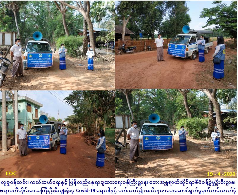 လူမှုဝန်ထမ်း၊ ကယ်ဆယ်ရေးနှင့် ပြန်လည်နေရာချထားရေးဝန်ကြီးဌာန၊ ဘေးအန္တရာယ်ဆိုင်ရာစီမံခန့်ခွဲမှုဉီးစီးဌာန၊ ဧရာဝတီတိုင်းဒေသကြီးဦးစီးမှူးရုံးမှ တာဝန်ရှိသူများသည် (၁၉-၄-၂၀၂၀)ရက်နေ့ (၀၇:၃၀)နာရီအချိန်မှစ၍ ပုသိမ်ခရိုင်၊ ကန်ကြီးထောင့်မြို့နယ်၊ အပင်နှစ်ဆယ်ကျေးရွာအုပ်စု၊ အပင်နှစ်ဆယ်ကျေးရွာ၊ ကိုးသောင်းကျေးရွာ၊ သံပတ်ကုန်းကျေးရွာ၊ သောကကုန်းကျေးရွာတို့၌လည်းကောင်း၊ ခုံဇင်ကုန်းကျေးရွာအုပ်စု၊ ခုံဇင်ကုန်းကျေးရွာ၊ ကျွန်းချောင်းကျေးရွာ၊ ရိုးကြီးကျေးရွာ၊ ရာပန်းကုန်းကျေးရွာတို့၌လည်းကောင်း၊ ဒဂုံးကြီးကျေးရွာအုပ်စု၊ ဒဂုံးကြီးကျေးရွာ၊ ဂျိုးပင်ဆိပ်ကျေးရွာ၊ ညောင်ပင်ကြီးကုန်းကျေးရွာနှင့် ရေကျော်ကျေးရွာတို့၌လည်းကောင်း လတ်တလောနိုင်ငံအသီးသီးတွင် ကူးစက်ပြန့်ပွား လျက်ရှိသော COVID-19 ကူးစက်ရောဂါနှင့်ပတ်သက်၍ ကျေးရွာနေပြည်သူများအား အသိပညာပေးဟောပြောခြင်းများ ဆောင်ရွက်ခဲ့ပါကြောင်း သတင်းရရှိပါသည်။