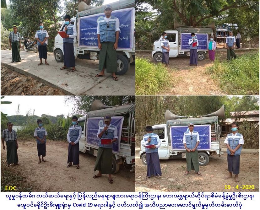 လူမှုဝန်ထမ်း၊ ကယ်ဆယ်ရေးနှင့် ပြန်လည်နေရာချထားရေးဝန်ကြီးဌာန၊ ဘေးအန္တရာယ်ဆိုင်ရာစီမံခန့်ခွဲမှုဉီးစီးဌာန၊ မအူပင်ခရိုင်ဦးစီးမှူးရုံးမှ တာဝန်ရှိသူများသည် (၁၉-၄-၂၀၂၀) ရက်နေ့တွင် မအူပင်မြို့နယ်၊ တာပါတ်အနောက်ကျေးရွာ အုပ်စုအတွင်းရှိ ကျေးရွာခွဲ(၄)ရွာ၌ Covid-19 ရောဂါ ကူးစက်ပျံ့ပွားမှုများ မဖြစ်ပွားစေရန်တွက် အများပြည်သူသိရှိ လိုက်နာဆောင်ရွက်ရန်အချက်များအား လော်စပီကာ ဟန်းစပီကာများဖြင့် လှည့်လည်ဟောပြောခြင်း ဆောင်ရွက်ခဲ့ပါ ကြောင်း သတင်းရရှိပါသည်။