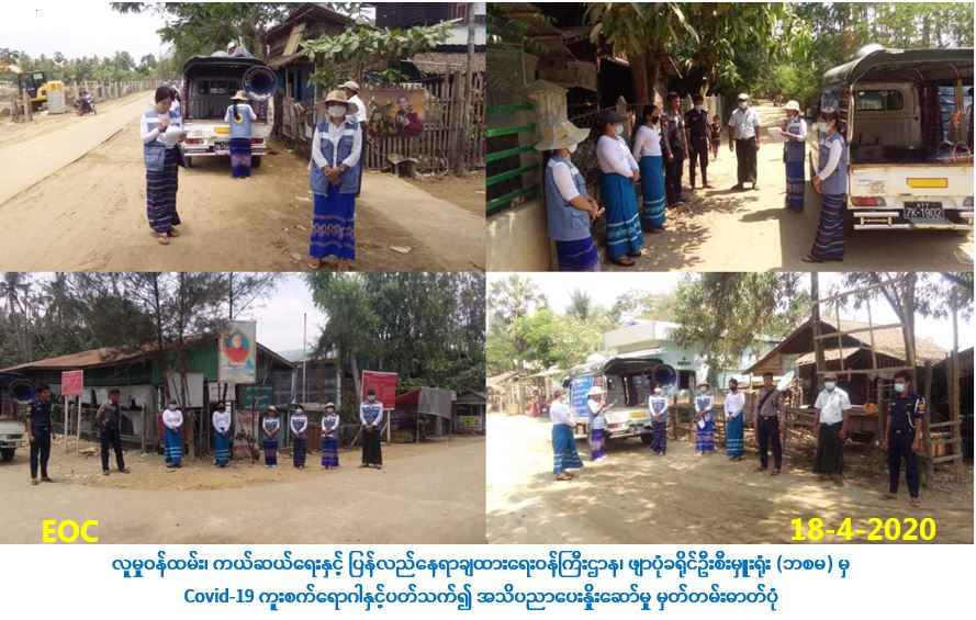 လူမှုဝန်ထမ်း၊ ကယ်ဆယ်ရေးနှင့် ပြန်လည်နေရာချထားရေးဝန်ကြီးဌာန၊ ဘေးအန္တရာယ်ဆိုင်ရာစီမံ ခန့်ခွဲမှုဦးစီးဌာန၊ ဖျာပုံခရိုင်ဦးစီးမှူးရုံးမှ တာဝန်ရှိသူများသည် ( ၁၈-၄-၂၀၂၀) ရက်နေ့တွင် ဖျာပုံမြို့နယ်၊ဒေါ်ညိမ်းကျေးရွာ၊ ခါးပြတ်ကျေးရွာ၊ ကမန္တာကျေးရွာ၊ ပက်ပြဲကျေးရွာ၊ အေးကုန်းကျေးရွာ၊ အောင်လှိုင်ကျေးရွာ၊ ကျုံကူးကျေးရွာ၊ အကြီးဝကျေးရွာများ၌ ခရိုင်လူမှုဝန်ထမ်းဦးစီးဌာနမှတာဝန်ရှိသူတို့နှင့်အတူ COVID-19 ရောဂါကူးစက်ပျံ့နှံ့မှုများ မဖြစ်ပွားစေရေးအတွက် လိုက်နာဆောင်ရွက်ရန်များကို ကျေးရွာရှိပြည်သူများအား အသိပညာပေးခြင်းလုပ်ငန်းများဆောင်ရွက်ခဲ့ပါကြောင်း သတင်းရရှိပါသည်။
