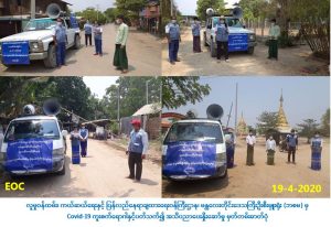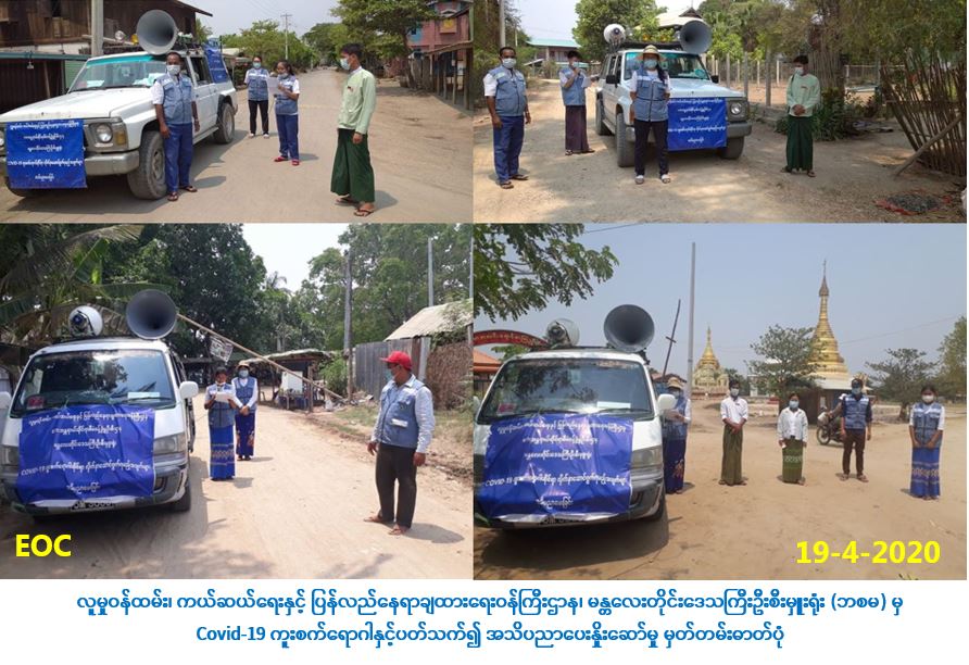 လူမှုဝန်ထမ်း၊ ကယ်ဆယ်ရေးနှင့် ပြန်လည်နေရာချထားရေးဝန်ကြီးဌာန၊ ဘေးအန္တရာယ်ဆိုင်ရာစီမံ ခန့်ခွဲမှုဦးစီးဌာန၊ မန္တလေးတိုင်းဒေသကြီးဦးစီးမှူးရုံးမှ တာ၀န်ရှိသူများသည် (၁၉-၄-၂၀၂၀) ရက်နေ့တွင် မြစ်သားမြို့နယ်အတွင်းရှိ ရပ်ကွက်၊ ကျေးရွာအုပ်စု၊ ကျေးရွာများတွင် COVID-19 ကူးစက်ရောဂါနှင့် ပတ်သက်သည့် ဆောင်ရန်/ ရှောင်ရန်များကိုအသံချဲ့စက်များဖြင့် အသိပညာပေးလုပ်ငန်းများအား ဆောင်ရွက်ခဲ့ပါကြောင်း သတင်းရရှိပါသည်။
