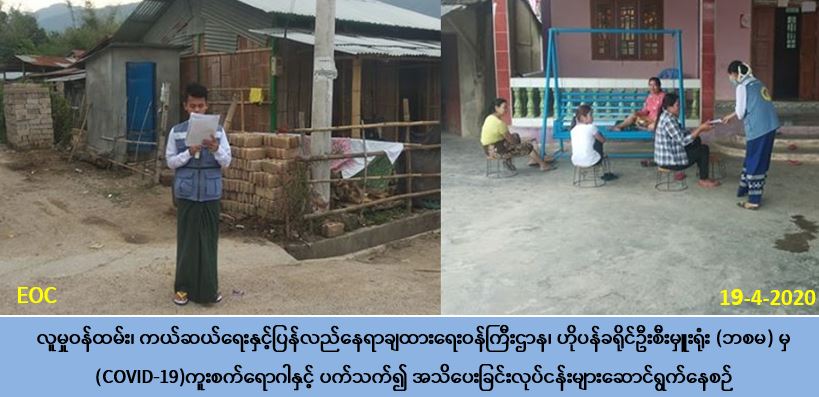 လူမှုဝန်ထမ်း၊ ကယ်ဆယ်ရေးနှင့် ပြန်လည်နေရာချထားရေးဝန်ကြီးဌာန၊ ဘေးအန္တရာယ်ဆိုင်ရာ စီမံခန့်ခွဲမှုဦးစီးဌာန ဟိုပန်ခရိုင်ဦးစီးမှူးရုံးမှ တာဝန်ရှိသူများသည် (၁၉-၄-၂၀၂၀) ရက်နေ့တွင် ဟိုပန်မြို့နယ်အတွင်းရှိ နမ့်လန်ကျေးရွာတွင် Covid-19ရောဂါကူးစက်ပျံ့နှံ့မှုမဖြစ်ပွားစေရန် သိရှိလိုက်နာဆောင်ရွက်ရမည့်အချက်များကို အသိပေးဟောပြောခြင်း၊ လက်ကမ်းစာစောင်များ ဖြန့်ဝေခြင်းကို မြန်မာဘာသာနှင့်ရှမ်းဘာသာတို့ဖြင့် ပြုလုပ်ခဲ့ပါကြောင်း သတင်းရရှိပါသည်။