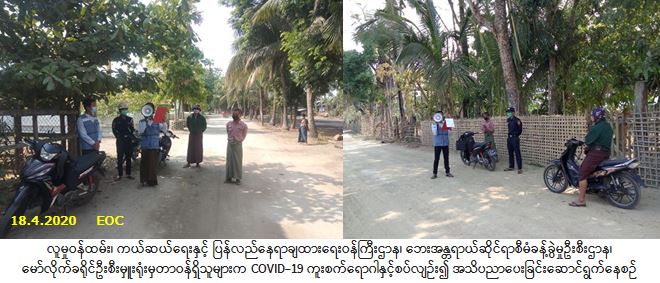 လူမှုဝန်ထမ်း၊ ကယ်ဆယ်ရေးနှင့် ပြန်လည်နေရာချထားရေးဝန်ကြီးဌာန၊ ဘေးအန္တရာယ်ဆိုင်ရာစီမံခန့်ခွဲမှုဦးစီး ဌာန၊ မော်လိုက်ခရိုင်ဦးစီးမှူးရုံးမှ တာဝန်ရှိသူများသည် (၁၈-၄-၂၀၂၀) ရက်နေ့တွင် တွန်းပင်ကျေးရွာ၊ မော်လိုက်ကလေးကျေးရွာ၊ ကင်းတပ်စံပြကျေးရွာစသည့်ကျေးရွာများ၌ COVID-19 ကူးစက်ရောဂါနှင့်စပ်လျဉ်း၍ ဆောင်ရန်/ရှောင်ရန်အချက်များကို လှည့်လည်အသိပေးနှိုးဆော်ခဲ့ပါကြောင်း သတင်းရရှိပါသည်။