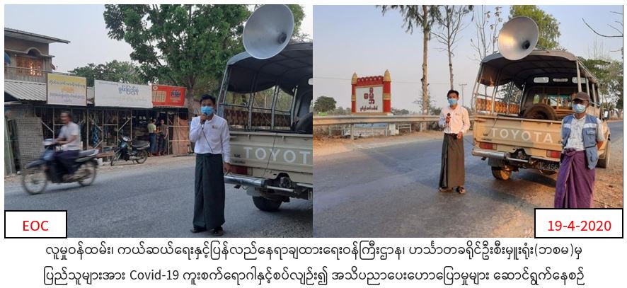 လူမှုဝန်ထမ်း၊ ကယ်ဆယ်ရေးနှင့်ပြန်လည်နေရာချထားရေးဝန်ကြီးဌာန၊ ဘေးအန္တရာယ်ဆိုင်ရာစီမံခန့်ခွဲမှုဦးစီးဌာန၊ ဟင်္သာတခရိုင်ဦးစီးမှူးရုံးမှ တာဝန်ရှိသူများသည် (၁၉-၄-၂၀၂၀) ရက်နေ့ နံနက် (၁၀:၀၀)နာရီအချိန်မှ စတင်ပြီး ဟင်္သာမြို့နယ်၊ ဓမ္ဘီတိုက်နယ် (တောရှည်၊သဲဖြူ၊နွယ်ခွေ၊ထန်ကုန်း) ကျေးရွာတို့တွင် လှည့်လည်ပြီး လတ်တလောဖြစ်ပွါးလျှက်ရှိသော COVID -19 ကူးစက်ရောဂါနှင့်ပတ်သက်ပြီး ဆောင်ရန်/ရှောင်ရန် များအား ကျေးရွာနေပြည်သူတို့အား အသိပညာပေးဟော ပြောဆောင်ရွက်ခဲ့ကြောင်း သတင်းရရှိပါသည်။
