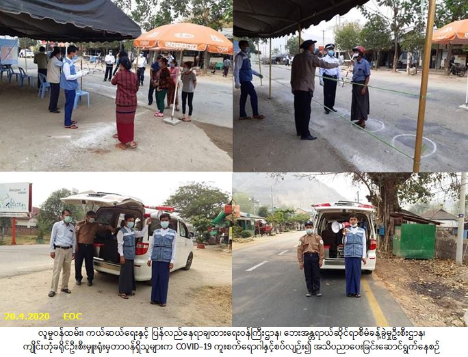 လူမှုဝန်ထမ်း၊ ကယ်ဆယ်ရေးနှင့် ပြန်လည်နေရာချထားရေးဝန်ကြီးဌာန၊ ဘေးအန္တရာယ်ဆိုင်ရာစီမံခန့်ခွဲမှုဦးစီး ဌာန၊ ကျိုင်းတုံခရိုင်ဦးစီးမှူးရုံးမှ တာဝန်ရှိသူများသည် (၂၀-၄-၂၀၂၀) ရက်နေ့တွင် မြို့နယ်အထွေထွေ အုပ်ချုပ်ရေဦးစီးဌာန၊ မြို့နယ်ပြည်သူ့ကျန်းမာရေးဦးစီးဌာန၊ မြို့နယ်ကြက်ခြေနီအသင်းတို့နှင့်ပူပေါင်း၍ ကျိုင်းတုံ-တာချီလိတ်၊ နောင်နွန်းစုပေါင်းဂိတ်၌ ကျိုင်းတုံမြို့တွင်းသို့ ယာဉ်အ၀င်/အထွက်များတွင် စီးနှင်းလိုက်ပါသောခရီးသည်များအား ကျန်းမာရေးစစ်ဆေးခြင်း၊ မှတ်တမ်းကောက်ယူခြင်းနှင့် ကျိုင်းတုံမြို့၊ နောင်ကုန်ကျေးရွာအုပ်စု၊ နောင်ကုန်ကျေးရွာတို့၌ COVID – 19 ကူးစက်ရောဂါနှင့်စပ်လျဉ်း၍ ကြိုတင်ကာကွယ်ထိန်းချုပ်နိုင်ရေးအတွက် ဆောင်ရန်/ရှောင်ရန်အချက်များကို အသိပညာပေးနှိုးဆော်ခဲ့ပါ ကြောင်း သတင်းရရှိပါသည်။