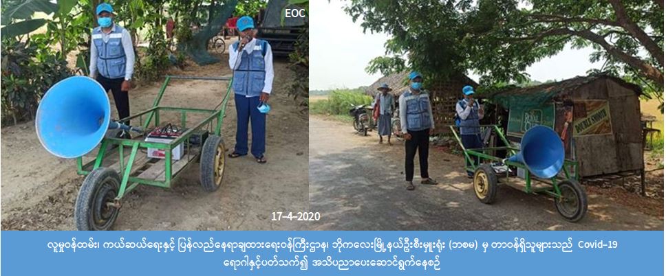 လူမှုဝန်ထမ်း၊ ကယ်ဆယ်ရေးနှင့် ပြန်လည်နေရာချထားရေးဝန်ကြီးဌာန၊ ဘေးအန္တရာယ်ဆိုင်ရာ စီမံခန့်ခွဲမှုဦးစီးဌာန၊ ဘိုကလေးမြိုနယ်ဦးစီးမှူးရုံးမှ တာဝန်ရှိသူများသည် (၁၇-၄-၂၀၂၀) ရက်နေ့တွင် (၀၉:၀၀)နာရီ၌ ဘိုကလေးမြို့နယ်၊ သပြုကုန်းကျေးရွာအုပ်စု၊ သပြုကုန်းကျေးရွာတွင်လည်းကောင်း၊ (၁၁:၃၀) နာရီ၌ ကျောင်းချောင်းကျေးရွာတွင်လည်းကောင်း Covid- 19 ကူးစက်ရောဂါနှင့်ပတ်သက်ပြီး ဆောင်ရန်၊ ရှောင်ရန်များ နှိုးဆော်ခြင်းအား ကျေးရွာရှိအုပ်ချုပ်ရေးမှူး၊ ရပ်မိရပ်ဖများနှင့်အတူ ကျေးရွာ နေပြည်သူတို့အား အသိပညာပေးခြင်းများ ဆောင်ရွက်ခဲ့ကြောင်း သိရှိရပါသည်။