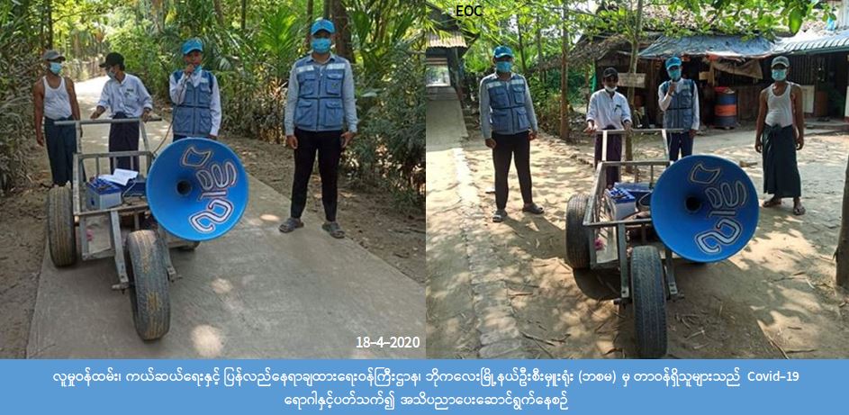 လူမှုဝန်ထမ်း၊ ကယ်ဆယ်ရေးနှင့် ပြန်လည်နေရာချထားရေးဝန်ကြီးဌာန၊ ဘေးအန္တရာယ်ဆိုင်ရာ စီမံ ခန့်ခွဲမှုဦးစီးဌာန၊ ဘိုကလေးမြိုနယ်ဦးစီးမှူးရုံးမှ တာဝန်ရှိသူများသည် (၁၈-၄-၂၀၂၀) ရက်နေ့တွင် (၀၈:၃၀) နာရီ၌ ဘိုကလေးမြို့နယ်၊ ပိုက်စလကျေးရွာအုပ်စု၊ ပိုက်စလကျေးရွာတွင်လည်းကောင်း၊ (၁၁:၀၀) နာရီ၌ ဝါးနက်ကုန်းကျေးရွာတွင်လည်းကောင်း၊ (၁၄:၀၀)နာရီ၌ ဝက်ကော်ကျေးရွာတွင် လည်း ကောင်း Covid- 19 ကူးစက်ရောဂါနှင့်ပတ်သက်ပြီး ဆောင်ရန်၊ ရှောင်ရန်များ နှိုးဆော်ခြင်းအား ကျေးရွာ ရှိအုပ်ချုပ်ရေးမှူး၊ ရပ်မိရပ်ဖများနှင့်အတူ ကျေးရွာနေပြည်သူတို့အား အသိပညာပေးခြင်းများ ဆောင်ရွက်ခဲ့ကြောင်း သိရှိရပါသည်။