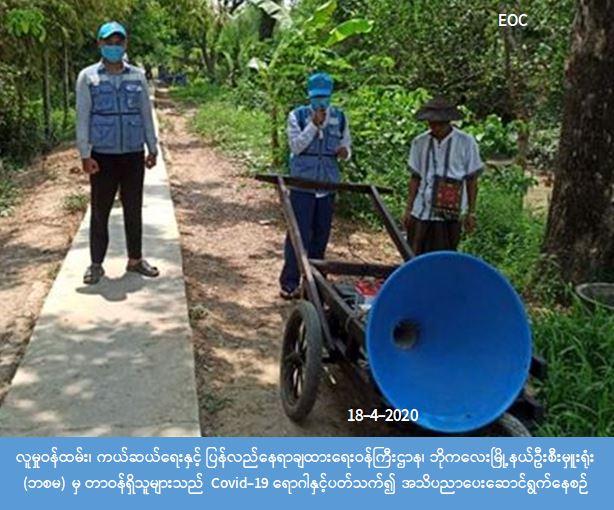 လူမှုဝန်ထမ်း၊ ကယ်ဆယ်ရေးနှင့် ပြန်လည်နေရာချထားရေးဝန်ကြီးဌာန၊ ဘေးအန္တရာယ်ဆိုင်ရာ စီမ ခန့်ခွဲမှုဦးစီးဌာန၊ ဘိုကလေးမြိုနယ်ဦးစီးမှူးရုံးမှ တာဝန်ရှိသူများသည် (၁၉-၄-၂၀၂၀) ရက်နေ့တွင် (၁၀:၀၀) နာရီ၌ ဘိုကလေးမြို့နယ်၊ အေးရွာကျေးရွာအုပ်စု၊ အေးရွာကျေးရွာတွင်လည်းကောင်း၊ (၁၂:၀၀) နာရီ၌ တုံကညင်ကျေးရွာတွင် လည်းကောင်း၊ (၁၃:၃၀)နာရီ၌ သစ်ကညင်ကျေးရွာတွင် လည်းကောင်း Covid- 19 ကူးစက်ရောဂါနှင့်ပတ်သက်ပြီး ဆောင်ရန်၊ ရှောင်ရန်များနှိုးဆော်ခြင်းအား ကျေးရွာရှိ အုပ်ချုပ်ရေးမှူး၊ ရပ်မိရပ်ဖများနှင့်အတူ ကျေးရွာနေပြည်သူတို့အား အသိပညာပေးခြင်းများ ဆောင်ရွက် ခဲ့ကြောင်း သိရှိရပါသည်။