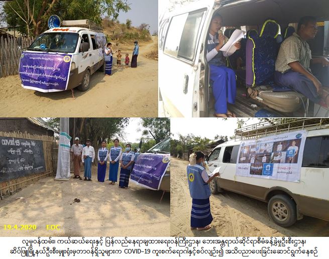 လူမှုဝန်ထမ်း၊ ကယ်ဆယ်ရေးနှင့် ပြန်လည်နေရာချထားရေးဝန်ကြီးဌာန၊ ဘေးအန္တရာယ်ဆိုင်ရာစီမံခန့်ခွဲမှုဦးစီး ဌာန၊ ဆိပ်ဖြူမြို့နယ်ဦးစီးမှူးရုံးမှ တာဝန်ရှိသူများသည် (၁၉-၄-၂၀၂၀) ရက်နေ့၊ နံနက် (၀၈:၀၀) နာရီအချိန်မှ (၁၅:၀၀) နာရီအချိန်အထိ ပြန်ကြားရေးနှင့်ပြည်သူ့ဆက်ဆံရေးဦးစီးဌာနမှ တာဝန်ရှိသူများ၊ ကျေးရွာအုပ်ချုပ် ရေးမှူးများနှင့်ပူးပေါင်း၍ မကွေးတိုင်းဒေသကြီး၊ ပခုက္ကူခရိုင်၊ ဒေါသာကျေးရွာအုပ်စုရှိ ဒေါသာကျေးရွာ၊ ဆင်နီတောင်ကျေးရွာ၊ အရှေ့ကံတွင်းကျေးရွာအုပ်စုရှိ အရှေ့ကံတွင်းကျေးရွာ၊ အရှေ့ကပိုင်ကျေးရွာ၊ အနောက်ကပိုင်ကျေးရွာ၊ ဆင်လမ်းချောင်းကျေးရွာ၊ ရွာမကျေးရွာအုပ်စုရှိ ရွာမ(မြောက်) ကျေးရွာ၊ ရွာမ(တောင်) ကျေးရွာတို့၌ COVID – 19 ကူးစက်ရောဂါနှင့်စပ်လျဉ်း၍ ဆောင်ရန်/ရှောင်ရန်အချက်များကို လှည့်လည် အသိပညာပေးနှိုးဆော်ခဲ့ပါကြောင်း သတင်းရရှိပါသည်။