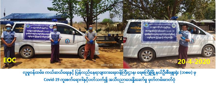 လူမှုဝန်ထမ်း၊ ကယ်ဆယ်ရေးနှင့် ပြန်လည်နေရာချထားရေးဝန်ကြီးဌာန၊ ဘေးအန္တရာယ်ဆိုင်ရာစီမံ ခန့်ခွဲမှုဉီးစီးဌာန၊ ရေစကြိုမြို့နယ်ဦးစီးမှူးရုံးမှ တာဝန်ရှိသူများသည် (၂၀-၄-၂၀၂၀) ရက်နေ့တွင် (၀၉းဝ၀) နာရီမှစတင်၍ (၁၃း၀၀) အချိန်ထိ ရေစကြိုမြို့နယ်၊ ကမ်းဖြူကျေးရွာအုပ်စု၊ ဗြိဘကျေးရွာအုပ်စုနှင့် ဂွေးဂုဏ်ကျေးရွာအုပ်စုတို့တွင် COVID-19ရောဂါကူးစက်ပျံ့နှံ့မှုများ မဖြစ်ပွားစေရန်အတွက် သိရှိလိုက်နာဆောင်ရွက်ရန်များကို လော်စပီကာဖြင့် အသိပေးကြေညာဆောင်ရွက်ခြင်းပြုလုပ်ခဲ့ကြောင်း သတင်းရရှိပါသည်။