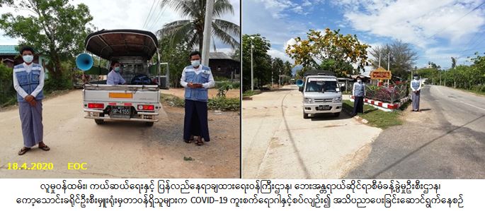 လူမှုဝန်ထမ်း၊ ကယ်ဆယ်ရေးနှင့် ပြန်လည်နေရာချထားရေးဝန်ကြီးဌာန၊ ဘေးအန္တရာယ်ဆိုင်ရာစီမံခန့်ခွဲမှုဦးစီး ဌာန၊ ကော့သောင်းခရိုင်ဦးစီးမှူးရုံးမှတာဝန်ရှိသူများသည် (၁၈-၄-၂၀၂၀) ရက်နေ့တွင် ကော့သောင်းခရိုင်၊ ဘုတ်ပြင်းမြို့နယ်၊ ရွှေဘုံသာရပ်ကွက်နှင့် အောင်မင်္ဂလာရပ်ကွက်တို့၌ COVID – 19 ကူးစက်ရောဂါနှင့်စပ်လျဉ်း၍ ဆောင်ရန်/ရှောင်ရန်အချက်များကို Loud Speaker ၊ Hand Speaker များဖြင့် လှည့်လည်အသိပညာပေး နှိုးဆော်ခဲ့ပါကြောင်း သတင်းရရှိပါသည်။