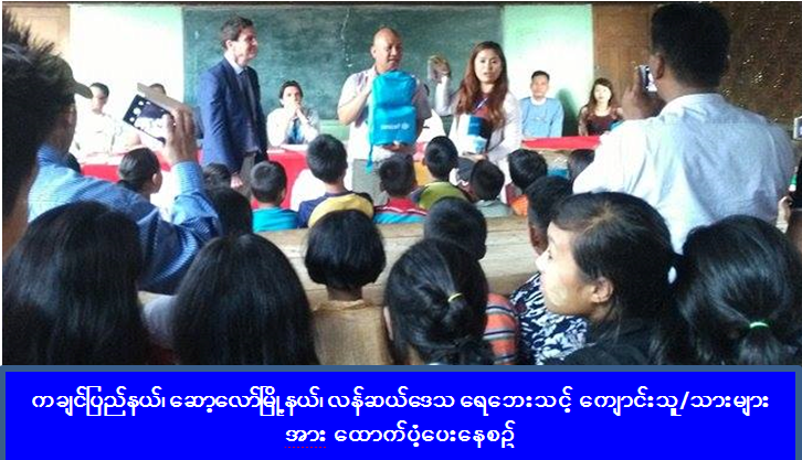 ကယ်ဆယ်ရေးနှင့် ပြန်လည်နေရာချထားရေးဦးစီးဌာန၊ ကချင်ပြည်နယ်ဦးစီးမှူးရုံးမှ တာဝန်ရှိသူများသည် (၁၃- ၆ -၂၀၁၆) ရက်နေ့တွင် ကချင်ပြည်နယ်၊ ဆော့လော်မြို့နယ်၊ လန်ဆယ်ဒေသ ရေဘေးသင့်ကျောင်းသူ/သား (၁၁၉) ဦးသည် မြစ်ကြီးနားမြို့သို့ေရာက်ရှိလျက်ရှိပြီး ပြည်နယ်အစိုးရအဖွဲ့၏ အစီအစဉ်ဖြင့် မြစ်ကြီနားမြို့ ရွှေစက်ရပ်ကွက်၊ နယ်မြေ(၁၃)၊ ခြံအမှတ် (၉၁)၌ နေထိုင်၍ပညာသင်ကြားလျက်ရှိပါသည်။ ထိုကျောင်းသူ/ သားများအတွက် (၇)ရက်စာ အစားအစာထောက်ပံ့မှုဖြင့် ဘီစကစ် (၁၆၆၆) ထုပ်ကို ဆော့လော်မဲဆန္ဒနယ် (၂ ) ပြည်နယ်လွှတ်တော်ကိုယ်စားလှယ် ဒေါ်ခေါ်မာဝူသို့လည်းကောင်း၊ (၂၁- ၆- ၂၀၁၆ ) ရက်နေ့တွင် လူမှုရေး ဝန်ကြီးဦးဆောင်၍ ဌာနဆိုင်ရာများနှင် UNICEF အဖွဲ့အစည်းတို့က ကျောင်းသုံးထောက်ပံ့ပစ္စည်းများ သန့်ရှင်းရေးသုံးပစ္စည်းများနှင့်ထောက်ပံ့ငွေများကိုပေးအပ်ခဲ့ပြီး ကချင်ပြည်နယ်ဦးစီးမှူးရုံး (ကဆရ) မှ အနေဖြင့် ကျောင်းသူ (၆၁) ဦးတွက် သန့်ရှင်းရေသုံးပစ္စည်း(၉)မျိုးပါ (၆၁) အိတ်၊ ကျောင်းသား (၅၈) ဦးတွက် သန့်ရှင်းရေသုံးပစ္စည်း (၈) မျိုးပါ (၅၈) အိတ်၊ စုစုပေါင်း (၁၁၉) အိတ်တို့အား ထောက်ပံ့ခဲ့ကြောင်း သတင်းရရှိပါသည်။