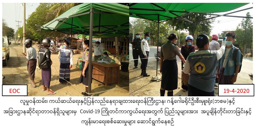 လူမှုဝန်ထမ်း၊ ကယ်ဆယ်ရေးနှင့်ပြန်လည်နေရာချထားရေးဝန်ကြီးဌာန၊ ဘေးအန္တရာယ်ဆိုင်ရာစီမံခန့်ခွဲမှုဦးစီးဌာန၊ ဂန့်ဂေါခရိုင်ဦးစီးမှူးရုံးမှ တာဝန်ရှိသူများသည် မြို့နယ်အထွေထွေအုပ်ချုပ်ရေးဦးစီးဌာန၊ ပရဟိတအဖွဲ့နင့် ဌာနဆိုင်ရာများဖြင့်ပူးပေါင်း၍ (၁၉-၄-၂၀၂၀)ရက်နေ့ (ဝ၈:၃၀)နာရီမှ (၁၇:၃၀) နာရီအချိန်ထိ လတ်တလောနိုင်ငံအသီးသီးတွင် ကူးစက်ပြန့်ပွားလျက်ရှိသည့် COVID-19 ရောဂါကြို တင်ကာကွယ်ရေးအတွက် ဂန့်ဂေါခရိုင်အတွင်းယာဉ် ဝင်/ထွက်အတွက် စီးနင်းလိုက်ပါလာသော ခရီးသည်များအား ကိုယ်အပူချိန်တိုင်းတာပေးခြင်းနှင့် ပြည်တွင်း/ပမှ ပြန်လာသူများအားစာရင်းပြုစုခြင်းတို့ကို ဆောင်ရွက်ခဲ့ပါကြောင်း သတင်းရရှိပါသည်။
