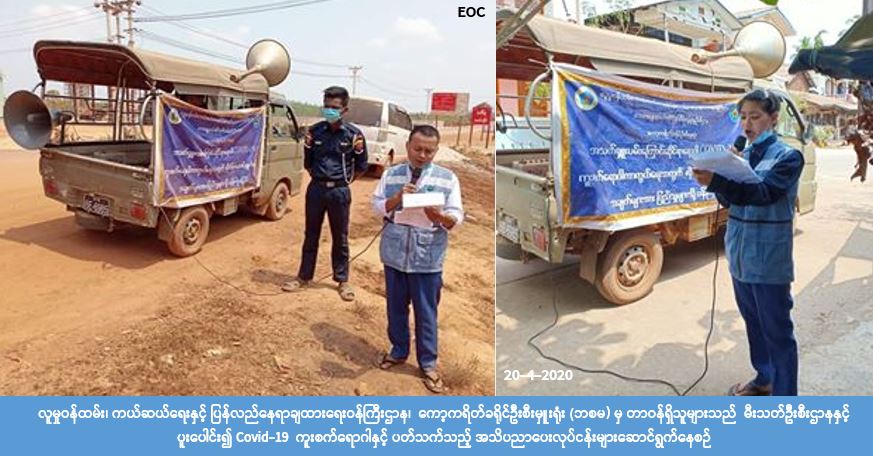 လူမှုဝန်ထမ်း၊ ကယ်ဆယ်ရေးနှင့် ပြန်လည်နေရာချထားရေးဝန်ကြီးဌာန ၊ ဘေးအန္တရာယ်ဆိုင်ရာစီမံခန့်ခွဲမှု ဦးစီးဌာန၊ ကော့ကရိတ်ခရိုင်ဦးစီးမှူးရုံးမှ တာဝန်ရှိသူများသည် မီးသတ်ဦးစီးဌာနနှင့်ပူးပေါင်း၍ (၂၀-၄-၂၀၂၀) ရက်နေ့၊ နံနက် (၈:၀၀) နာရီချိန်မှ နေ့လည် (၁၂:၀၀)နာရီချိန်ထိ ကော့ကရိတ်မြို့၊ ကမ်းနီကျေးရွာ ၌ လှည့်လည်ပြီး လတ်တလော နိုင်ငံတိုင်းတွင်ဖြစ်ပွားလျက်ရှိသော COVID-19 ကူးစက်ရောဂါနှင့် ပတ်သက်၍ ဆောင်ရန်၊ ရှောင်ရန်များကို ကျေးရွာနေပြည်သူတို့အား အသိပညာပေးဟောပြော ဆောင်ရွက်ခဲ့ကြောင်း သိရှိရပါသည်။