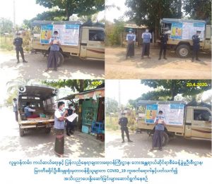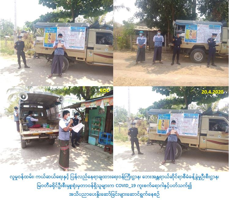 လူမှုဝန်ထမ်း၊ ကယ်ဆယ်ရေးနှင့် ပြန်လည်နေရာချထားရေးဝန်ကြီးဌာန၊ ဘေးအန္တရာယ်ဆိုင်ရာစီမံခန့်ခွဲမှုဦးစီးဌာန၊ မြဝတီခရိုင်ဦးစီးမှူးရုံးမှ တာဝန်ရှိသူများသည် (၂၀-၄-၂၀၂၀) ရက်နေ့တွင် မြဝတီမြို့အတွင်းရှိ မေတ္တာလင်းမြိုင်ကျေးရွာအုပ်စု၊ အမှတ် (၁၊ ၂၊ ၃၊ ၄၊ ၅၊ ၆) ရပ်ကွက်နှင့် အမှတ် (၂-ခ) ရပ်ကွက်တို့တွင် Covid-19 အသက်ရှူလမ်းကြောင်းဆိုင်ရာရောဂါနှင့် ပတ်သက်၍ အများပြည်သူများသိရှိလိုက်နာရန် ကျန်းမာရေးနှင့် အားကစားဝန်ကြီးဌာနမှ ထုတ်ပြန်ထားသော အသိပေးကြေငြာချက်များ၊ လူမှုဝန်ထမ်းကယ်ဆယ်ရေးနှင့် ပြန်လည်နေရာချထားရေး ဝန်ကြီးဋ္ဌာနမှထုတ်ပြန်ထားသော ဥပဒေများကို ကွင်းဆင်း၍ အသိပေးကြေငြာမှုများ ပြုလုပ်ဆောက်ရွက်ခဲ့ပါကြောင်း သတင်းရရှိပါသည်။