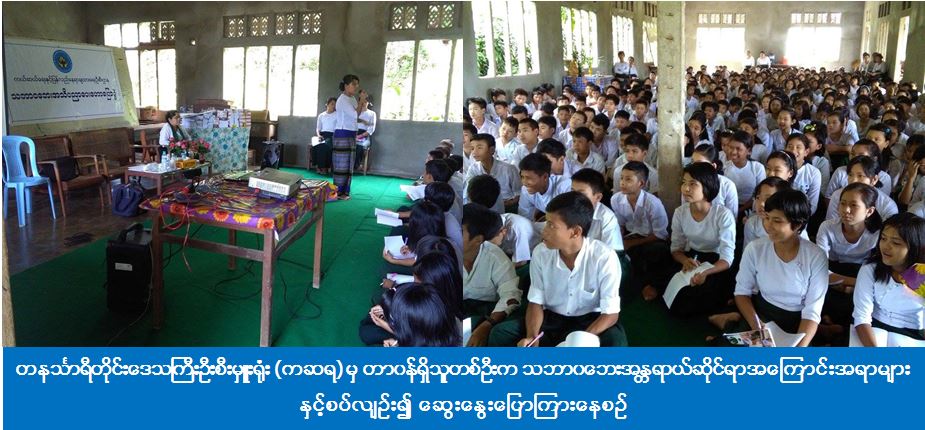 (၂၃-၆-၂၀၁၆) ရက်နေ့တွင် တနင်္သာရီတိုင်းဒေသကြီး၊ အ.လ.က (၄) ထားဝယ်၌ သဘာဝဘေးအသိပညာပေးဟောပြောပွဲ ကျင်းပပြုလုပ်ခဲ့ရာ တိုင်းဒေသကြီးဦးစီးမှူးရုံး (ကဆရ) မှ တာဝန်ရှိသူများက သဘာဝဘေးအန္တရာယ်ဆိုင်ရာအကြောင်းအရာများ၊ ဆောင်ရန် ရှောင်ရန်အချက်များနှင့်စပ်လျဉ်း၍ ဆွေးနွေးပြောကြားခဲ့ပါသည်။ ဆွေးနွေးပွဲသို့ ကျောင်းသား/သူအင်အား (၃၅၅) ဦး တက်ရောက်ခဲ့ပြီး အဆိုပါကျောင်းသား/သူများအတွက် ဗလာစာအုပ်များ၊ ဘောလ်ပင်များ၊ လက်ကမ်းစာစောင်များနှင့် ပိုစတာများ ဝေငှပေးခဲ့ကြောင်း သိရှိရပါသည်။