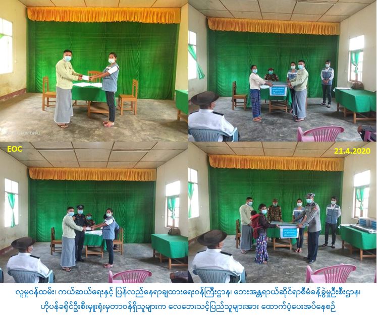 လူမှုဝန်ထမ်း၊ ကယ်ဆယ်ရေးနှင့် ပြန်လည်နေရာချထားရေးဝန်ကြီးဌာန၊ ဘေးအန္တရာယ်ဆိုင်ရာစီမံခန့်ခွဲမှုဦးစီးဌာန၊ ဟိုပန်ခရိုင်ဦးစီးမှူးရုံးမှတာဝန်ရှိသူများသည် (၁၇-၄-၂၀၂၀) ရက်နေ့ (၁၈:၃၀) အချိန်၌ ပန်လုံမြို့တွင် မိုးသီးကြွေကျခြင်းနှင့် လေပြင်းတိုက်ခတ်မှုကြောင့် နေအိမ် (၃) လုံး အမိုးလန်ပြိုကျပျက်စီးခဲ့ရာ ဆုံးရှုံးမှုတန်ဖိုး (၄၅၀၀၀၀/-) ကျပ်ဖြစ်ပြီး၊ အဆိုပါ လေဘေးသင့်အိမ်ထောင်စု (၃) စုစာအတွက် အိမ်ဆောက်ပစ္စည်းဖိုးထောက်ပံ့ငွေ (၃၀၀၀၀၀/-) ကျပ်၊ ဆန်ရိက္ခာ (၇) ရက်စာ လူဦးရေ (၂၄)ဦးအတွက်ထောက်ပံ့ငွေ (၅၀၄၀၀/-)ကျပ်၊ စုစုပေါင်းထောက်ပံ့ငွေ (၃၅၀၄၀၀/-) ကျပ်နှင့် ကယ်ဆယ်ရေးပစ္စည်း (၁၇)မျိုး (၃) စုစာအား ပန်လုံမြို့ အထွေထွေအုပ်ချုပ်ရေးဦးစီးဌာန၊ မြို့အုပ်ချုပ်ရေးမှူးရုံးခန်းမ၌ (၂၁-၄-၂၀၂၀)ရက်နေ့၊ (၁၀:၀၀) အချိန်တွင် ဘေးသင့်ပြည်သူများလက်ဝယ်သို့ သွားရောက်ထောက်ပံ့ခဲ့ပါကြောင်း သတင်းရရှိပါသည်။