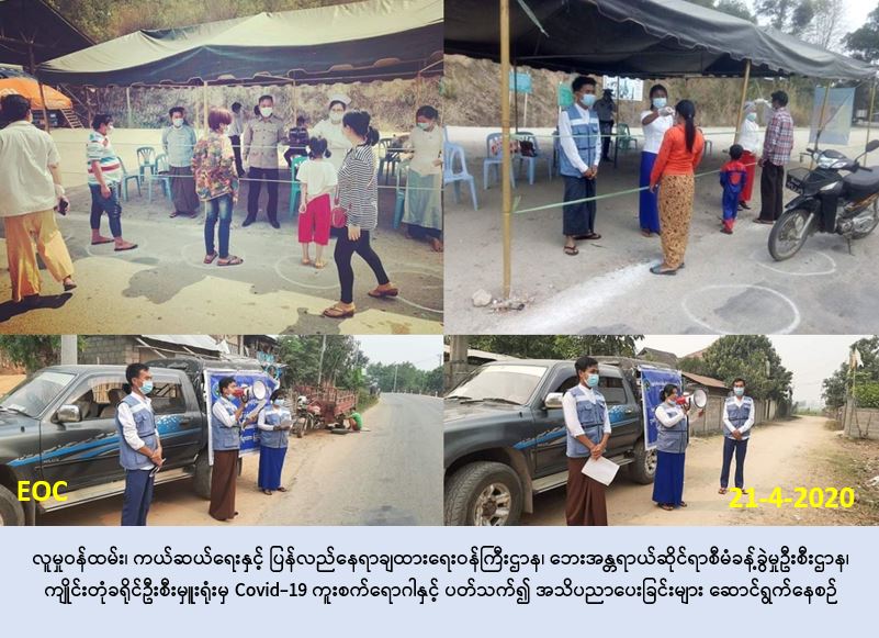 လူမှုဝန်ထမ်း၊ ကယ်ဆယ်ရေးနှင့် ပြန်လည်နေရာချထားရေးဝန်ကြီးဌာန၊ ဘေးအန္တရာယ်ဆိုင်ရာ စီမံခန့်ခွဲမှုဦးစီးဌာန၊ ကျိုင်းတုံခရိုင်ဦးစီးမှူးရုံးမှ တာ၀န်ရှိသူများသည်( ၂၁ – ၄ -၂၀၂၀ ) ရက်နေ့တွင် မြို့နယ်အထွေထွေအုပ်ချုပ်ရေးဦးစီးဌာန၊ မြို့နယ်ပြည်သူ့ကျန်းမာရေးဦးစီးဌာန၊ မြို့နယ်ကြက်ခြေနီအသင်းတို့နှင့်ပူပေါင်း၍ ကျိုင်းတုံ – တာချီလိတ်၊ နောင်နွန်းစုပေါင်းဂိတ်၌ ကျိုင်းတုံမြို့တွင်းသို့ အ၀င် /အထွက်ယာဉ်လိုင်းများတွင် စီးနှင်းလိုက်ပါသော ခရီးသည်များအား ကျန်းမာရေးစစ်ဆေးခြင်း၊ မှတ်တမ်းကောက်ယူခြင်းနှင့် ကျိုင်းတုံမြို့ယန်းကျိန်ကျေးရွာအုပ်စု၊ ယန်းကျိန်ကျေးရွာနှင့်ကတ်ဖကျေးရွာအုပ်စု၊ ကတ်ဖကျေးရွာတို့တွင် လတ်တလော နိုင်ငံအသီး သီးတွင် ကူးစက်ပြန့်ပွားလျက်ရှိသော COVID-19 ရောဂါ ကူးစက်ပြန့်နှံ့မှုမဖြစ်ပွားစေရန် သိရှိ လိုက်နာဆောင်ရွက်ရမည့် အချက်များကို အသိပညာပေးဟောပြောခဲ့ကြောင်း သတင်းရရှိ ပါသည်။