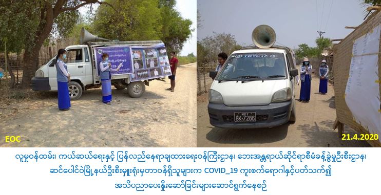 လူမှုဝန်ထမ်း၊ ကယ်ဆယ်ရေးနှင့် ပြန်လည်နေရာချထားရေးဝန်ကြီးဌာန၊ ဘေးအန္တရာယ်ဆိုင်ရာစီမံခန့်ခွဲမှုဦးစီးဌာန၊ ဆင်ပေါင်ဝဲမြို့နယ်ဦးစီးမှူးရုံးမှတာဝန်ရှိသူများသည် (၂၁-၄-၂၀၂၀) ရက်နေ့၊ နံနက် (၀၇:၀၀) နာရီအချိန်တွင် ပြန်ကြားရေးနှင့် ပြည်သူ့ဆက်ဆံရေးဦးစီးဌာနနှင့် ပူးပေါင်း၍ ဆင်ပေါင်ဝဲမြို့နယ်၊ စည်တိုင်းကျေးရွာအုပ်စု၊ စည်တိုင်းကျေးရွာ၊ မကြီးကုန်းကျေးရွာ၊ ပိတောက်ကန်ကျေးရွာ၊ စမ်းကျေးရွာများသို့ သွားရောက်ပြီး COVID-19 ရောဂါ ကူးစက်ပျံ့နှံ့ မှုများမဖြစ်ပွာစေရေး အသိပညာပေးဟောပြောမှုများ ဆောင်ရွက်ခဲ့ပါကြောင်း သတင်းရရှိပါသည်။