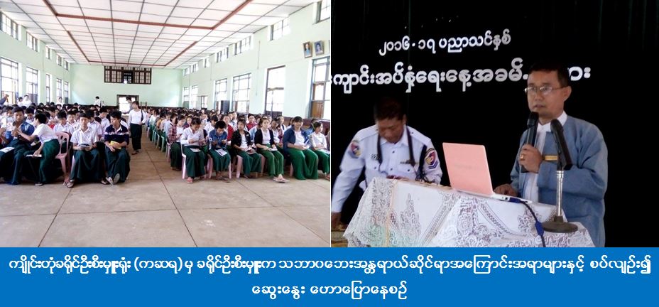 (၂၄-၆-၂၀၁၆) ရက်နေ့တွင် ရှမ်းပြည်နယ်၊ ကျိုင်းတုံမြို့၊ အမှတ် (၂) အခြေခံပညာအထက်တန်းကျောင်း၌ သဘာဝဘေးအန္တရာယ်ဆိုင်ရာအသိပညာပေးဟောပြောပွဲ ကို ကျင်းပပြုလုပ်ခဲ့ရာ ကျိုင်းတုံခရိုင်ဦးစီးမှူးရုံး (ကဆရ) မှ ခရိုင်ဦးစီးမှူးက သဘာဝဘေးအန္တရာယ်ဆိုင်ရာအကြောင်းအရာများနှင့်စပ်လျဉ်း၍ ဆွေးနွေးဟောပြောခဲ့ပြီး တက်ရောက်လာကြသည့် ကျောင်းသား/သူများအား သဘာဝဘေးအန္တရာယ်ဆိုင်ရာလက်ကမ်းစာစောင်များကို ဖြန့်ဝေပေးခဲ့ပါသည်။ ဟောပြောပွဲသို့ ကျောင်းသား/သူ (၃၁၀) ဦးတက်ရောက်ခဲ့ကြောင်း သိရှိရပါသည်။