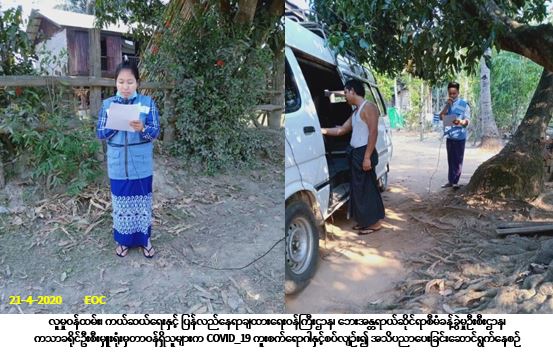 လူမှုဝန်ထမ်း၊ ကယ်ဆယ်ရေးနှင့် ပြန်လည်နေရာချထားရေးဝန်ကြီးဌာန၊ ဘေးအန္တရာယ်ဆိုင်ရာစီမံခန့်ခွဲမှုဉီးစီးဌာန၊ ကသာခရိုင်ဦးစီးမှူးရုံးမှတာဝန်ရှိသူများသည် (၂၁-၄-၂၀၂၀) ရက်နေ့၊ (၁၀:၀၀)နာရီအချိန်မှစတင်၍ ကသာမြို့နယ်၊ ပုလွှေရွှေကျေးရွာ၊ ဒုံးအော့ကျေးရွာ၊ ကျောက်ထုံးကြီးကျေးရွာတို့၌ COVID-19 ကူးစက်ရောဂါနှင့်စပ်လျဉ်း၍ ဆောင်ရန်/ရှောင်ရန်အချက်များကို အသိပညာပေးနှိုးဆော်ခဲ့ပါကြောင်း သတင်းရရှိိပါသည်။