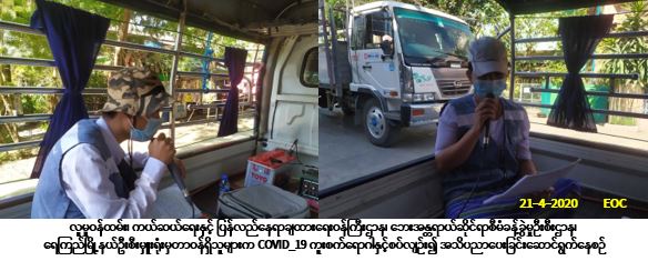 လူမှုဝန်ထမ်း၊ ကယ်ဆယ်ရေးနှင့် ပြန်လည်နေရာချထားရေးဝန်ကြီးဌာန၊ ဘေးအန္တရာယ်ဆိုင်ရာစီမံခန့်ခွဲမှုဉီးစီးဌာန၊ ရေကြည်မြို့နယ်ဦးစီးမှူးရုံးမှတာဝန်ရှိသူများသည် (၂၁-၄-၂၀၂၀) ရက်နေ့၊ (၀၈:၃၀)နာရီအချိန်မှ (၁၀:၃၀)နာရီအချိန်အထိ ရေကြည်မြို့နယ်၊ ငါးသိုင်းချောင်းမြို့၊ မြို့မရပ်ကွက်၌လည်းကောင်း၊ (၁၀:၃၀)နာရီအချိန်မှ (၁၂:၀၀)နာရီအချိန်အထိ အောင်ဆန်းရပ်ကွက်၌လည်းကောင်း၊ (၁၃:၃၀)နာရီအချိန်မှ (၁၄:၃၀)နာရီအချိန်အထိ ရှေ့ဆောင်ရပ်ကွက်၌လည်းကောင်း၊ (၁၄:၃၀)နာရီအချိန်မှ (၁၆:၀၀)နာရီအချိန်အထိ မြို့သစ်ရပ်ကွက်၌လည်းကောင်း COVID-19 ကူးစက်ရောဂါနှင့်စပ်လျဉ်း၍ ဆောင်ရန်/ရှောင်ရန်အချက်များကို အသိပညာပေး နှိုးဆော်ခဲ့ပါကြောင်း သတင်းရရှိိပါသည်။