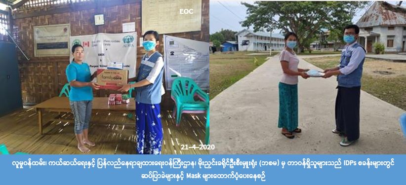လူမှုဝန်ထမ်း၊ကယ်ဆယ်ရေးနှင့်ပြန်လည်နေရာချထားရေးဝန်ကြီးဌာန၊ ဘေးအန္တရာယ်ဆိုင်ရာ စီမံခန့်ခွဲမှု ဦးစီးဌာန၊ မိုးညှင်းခရိုင်ဦးစီးမှူးရုံးမှတာဝန်ရှိသူများသည် (၂၁-၄-၂၀၂၀)ရက်နေ့ (၁၁:၃၀)အချိန်၌ မိုးညှင်း မြို့နယ်၊ IDPs စခန်း(၂)ခုရှိ ပြည်သူများအား COVID-19 ကူးစက်ရောဂါနှင့်ပတ်သက်၍ ဆောင်ရန်၊ ရှောင်ရန်အချက်များ အသိပညာပေးဆောင်ရွက်ခဲ့ပြီး စခန်း(၂)ခုရှိ အိမ်ထောင်စု(၃၂)စုအတွက် အိမ်ထောင်စု (၁) စုလျှင် ဆပ်ပြာ(၂)ခဲနှုန်းနှင့် Mask (၂) ခုနှုန်းဖြင့် စုစုပေါင်းဆပ်ပြာ (၆၄) ခဲနှင့်Mask (၆၄) ခုအား ထောက်ပံ့ပေးခဲ့ပါကြောင်း သိရှိရပါသည်။