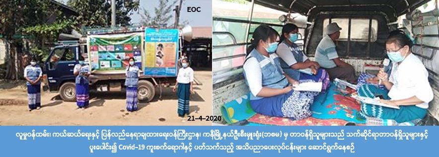 လူမှုဝန်ထမ်း၊ ကယ်ဆယ်ရေးနှင့် ပြန်လည်နေရာချထားရေးဝန်ကြီးဌာန၊ ဘေးအန္တရာယ်ဆိုင်ရာ စီမံခန့်ခွဲမှု ဦးစီးဌာန၊ ကနီမြို့နယ်ဦးစီးမှူးရုံးမှ တာဝန်ရှိသူများသည်(၂၁-၄-၂၀၂၀)ရက် နေ့တွင် (၈:၃၀) အချိန်မှ (၁၇:ဝဝ) အချိန်ထိ ကနီမြို့နယ်အတွင်းရှိ ဇီးပင်တွင်းကျေးရွာ၊ ရွှေပြည်သာကျေးရွာ၊ ပေါက်အင်းမြိုင် ကျေးရွာ၊ ပေါက်အင်းတောင်ကျေးရွာ၊ အင်တိုင်းတောကျေးရွာ၊ ညောင်ပင်လယ်ကျေးရွာများအတွင်း အသံချဲ့စက်ဖြင့် လှည့်လည်၍ Covid- 19 ကာကွယ်ထိန်းချုပ်ရေးဆိုင်ရာ ကျန်းမာရေးအသိပညာပေး လိုက်နာရန်အချက်များအား ပြန်ကြားရေးနှင့်ပြည်သူ့ဆက်ဆံရေးဦးစီးဌာန၊ ကျေးရွာအုပ်ချုပ်ရေးမှူး များနှင့်အတူ အသိပညာပေးဟောပြောဆွေးနွေးခဲ့ပါကြောင်းနှင့် ပြည်သူသို့ပန်ကြားချက်များအား ဖြန့်ဝေ ပေးခဲ့ပါကြောင်း သိရှိရပါသည်။
