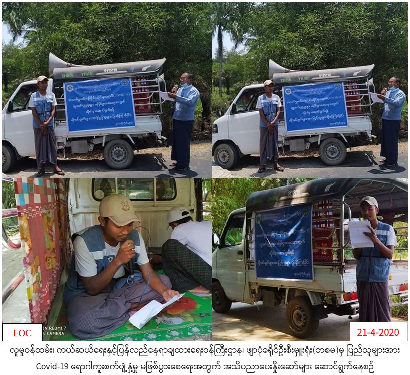 လူမှုဝန်ထမ်း၊ ကယ်ဆယ်ရေးနှင့်ပြန်လည်နေရာချထားရေးဝန်ကြီးဌာန၊ ဘေးအန္တရာယ်ဆိုင်ရာစီမံခန့်ခွဲမှုဦးစီးဌာန၊ ဖျာပုံခရိုင်ဦးစီးမှူးရုံးမှ တာဝန်ရှိသူများသည် ( ၂၁-၄-၂၀၂၀) ရက်နေ့တွင် ကျိုက်လတ်မြို့နယ်၊ ကွင်းချောင်းကြီးကျေးရွာ၊ အရွဲကျေးရွာ၊ အိုင်သရဲကျေးရွာ၊ ကွန်ပလိုင်းကျေးရွာ၊ သရက်တောကျေးရွာ၊ အိမ်ယာကြီးကျေးရွာ၊ ကွပ်လိပ်ကျေးရွာ၊ သရက်ငူအထက်၊ သရက်ငူအောက်ကျေးရွာများ၌ ခရိုင်လူမှုဝန်ထမ်းဦးစီးဌာနမှ တာဝန်ရှိသူတို့နှင့်အတူ COVID-19 ရောဂါကူးစက်ပျံ့နှံ့မှုများ မဖြစ်ပွားစေရေးအတွက် လိုက်နာဆောင်ရွက်ရန်များကို ကျေးရွာရှိပြည်သူများအား အသိပညာပေးခြင်းလုပ်ငန်းများဆောင်ရွက်ခဲ့ကြောင်း သတင်းရရှိပါသည်။