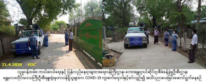 လူမှုဝန်ထမ်း၊ ကယ်ဆယ်ရေးနှင့် ပြန်လည်နေရာချထားရေးဝန်ကြီးဌာန၊ ဘေးအန္တရာယ်ဆိုင်ရာစီမံခန့်ခွဲမှုဦးစီး ဌာန၊ မန္တလေးတိုင်းဒေသကြီးဦးစီးမှူးရုံးမှတာဝန်ရှိသူများသည် (၂၁-၄-၂၀၂၀) ရက်နေ့တွင် မြစ်သားမြို့နယ် နှင့် စဉ့်ကိုင်မြို့နယ်အတွင်းရှိ ရပ်ကွက်/ ကျေးရွာအုပ်စု/ ကျေးရွာများ၌ COVID – 19 ကူးစက်ရောဂါနှင့်စပ်လျဉ်း၍ ဆောင်ရန်/ရှောင်ရန်အချက်များကို အသံချဲ့စက်ဖြင့် အသိပညာပေး နှိုးဆော်ခဲ့ပါကြောင်း သတင်းရရှိပါသည်။