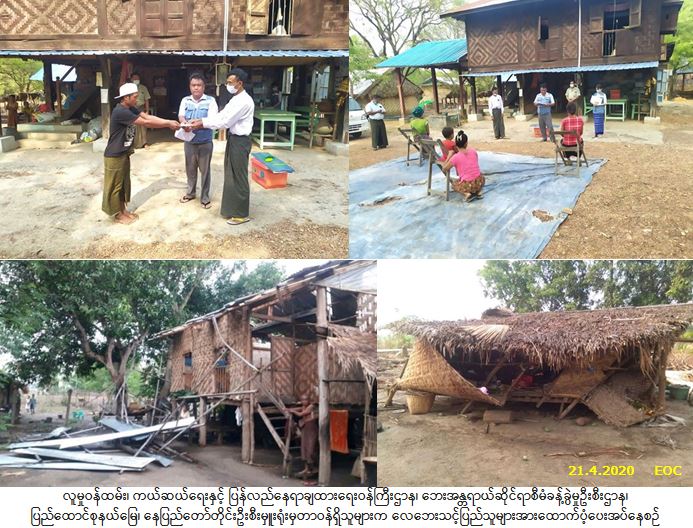 လူမှုဝန်ထမ်း၊ ကယ်ဆယ်ရေးနှင့် ပြန်လည်နေရာချထားရေးဝန်ကြီးဌာန၊ ဘေးအန္တရာယ်ဆိုင်ရာစီမံခန့်ခွဲမှုဦးစီး ဌာန၊ ပြည်ထောင်စုနယ်မြေ၊ နေပြည်တော်တိုင်းဦးစီးမှူးရုံးမှတာဝန်ရှိသူများသည် ပြည်ထောင်စုနယ်မြေ၊ နေပြည်တော်၊ ဒက္ခိဏခရိုင်၊ လယ်ဝေးမြို့နယ်အတွင်းရှိ ပြောင်ခေါင်းကြီးအုပ်စု၊ ပြောင်ခေါင်းကြီးကျေးရွာ၊ ပန်းတင်ကျေးရွာ၊ ကန်စွန်းအင်းကျေးရွာနှင့် သာယာကြီးကျေးရွာတို့၌ (၂၀-၄-၂၀၂၀) ရက်နေ့၊ (၁၇:၀၀) နာရီအချိန်တွင် ဖြစ်ပွားခဲ့သောလေဘေးကြောင့် ပြိုလဲအိမ်ခြေ (၂) လုံး၊ အမိုးလန်အိမ်ခြေ (၁၃) လုံးအတွက် အိမ်ဆောက်ပစ္စည်းဖိုးထောက်ပံ့ငွေ (၅၄၀,၀၀ဝ/-) ကျပ်၊ ဘေးသင့်လူဦးရေ (၆၉) ဦးအတွက် ဆန်ရိက္ခာဖိုး ထောက်ပံ့ငွေ (၁၄၄,၉၀ဝ/-) ကျပ်၊ ပြိုလဲအိမ်ခြေ(၂)လုံးအတွက် ကယ်ဆယ်ရေးပစ္စည်း (၁၇)မျိုး(၂)အိမ်ထောင်စုစာတို့ကို (၂၁-၄-၂၀၂၀) ရက်နေ့၊ (၁၅:၃၀) နာရီအချိန်တွင် ပြည်သူများလက်ဝယ်အရောက် သွားရောက်ထောက်ပံ့ ပေးအပ်ခဲ့ပါကြောင်း သတင်းရရှိပါသည်။