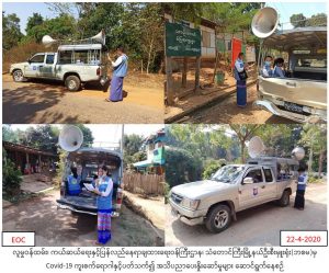 လူမှုဝန်ထမ်း၊ ကယ်ဆယ်ရေးနှင့်ပြန်လည်နေရာချထားရေးဝန်ကြီးဌာန ဘေးအန္တရာယ်ဆိုင်ရာစီမံခန့်ခွဲမှုဦးစီးဌာန၊ သံတောင်ကြီးမြို့နယ်ဦးစီးမှူးရုံးမှ တာဝန်ရှိသူများသည် (၂၂. ၄.၂၀၂၀)ရက်နေ့ မနက်(၉:၃၀)အချိန်မှ နေ့လည် (၁၁:၃၀)အချိန်ထိ လိပ်သိုမြို့အတွင်းရှိ ကျေးရွာများဖြစ်သော သာမိုးတောင်ကျေးရွာနှင့် အလယ်ချောင်းကျေးရွာများသို့ COVID -(19) ရောဂါပျံ့နှံ့မှုများ မဖြစ်ပွားစေရန်အတွက် အသံချဲ့စက်ဖြင့် အသိပညာပေးဟောပြောခြင်းများ ဆောင်ရွက်ခဲ့ကြောင်း သတင်းရရှိပါသည်။