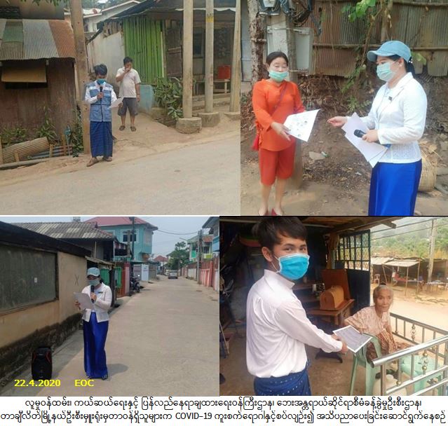 လူမှုဝန်ထမ်း၊ ကယ်ဆယ်ရေးနှင့် ပြန်လည်နေရာချထားရေးဝန်ကြီးဌာန၊ ဘေးအန္တရာယ်ဆိုင်ရာစီမံခန့်ခွဲမှုဦးစီး ဌာန၊ တာချီလိတ်မြို့နယ်ဦးစီးမှူးရုံးမှတာဝန်ရှိသူများသည် (၂၂-၄-၂၀၂၀) ရက်နေ့တွင် တာချီလိတ်မြို့၊ ပုန်းထွန်(ကျောက်တောင်)ရပ်ကွက်၌ COVID – 19 ကူးစက်ရောဂါနှင့်စပ်လျဉ်း၍ ဆောင်ရန်/ရှောင်ရန်အချက်များ ကို ဗမာ၊ ရှမ်းဘာသာစကားများဖြင့် လှည့်လည်အသိပညာပေး နှိုးဆော်ခဲ့ပြီး လက်ကမ်းစာစောင်များ ဖြန့်ဝေခဲ့ပါကြောင်း သတင်းရရှိပါသည်။