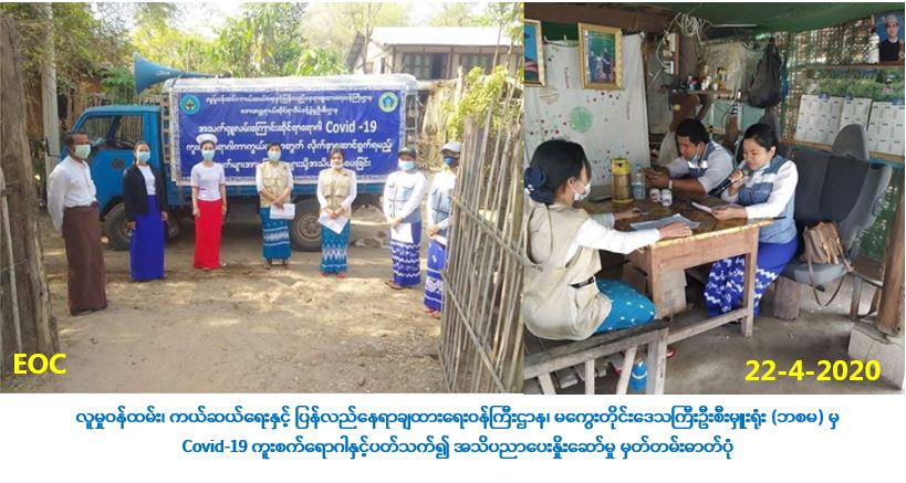 လူမှုဝန်ထမ်း၊ ကယ်ဆယ်ရေးနှင့် ပြန်လည်နေရာချထားရေးဝန်ကြီးဌာန၊ ဘေးအန္တရာယ်ဆိုင်ရာစီမံ ခန့်ခွဲမှုဉီးစီးဌာန၊ မကွေးတိုင်းဒေသကြီးဦးစီးမှူးရုံးမှ တာဝန်ရှိသူများသည် (၂၂-၄-၂၀၂၀) ရက်နေ့၊ နံနက် (၀၇:၀၀) နာရီအချိန်မှ စတင်ပြီး မကွေးမြို့နယ်၊ သရက်လေးပင်ကျေးရွာ၊ ကြောင်ပြောက်ကျေးရွာနှင့် ကြာပြည့်အင်းကျေးရွာများသို့လှည့်လည်ပြီး COVID-19 ကူးစက်ရောဂါနှင့်ပတ်သက်ပြီး ဆောင်ရန်/ ရှောင်ရန် တို့ကို ရပ်ကွက်အုပ်ချုပ်ရေးမှူးများ၊ ကျန်းမာရေးဦးစီးဌာန တို့နှင့်အတူ ပူးပေါင်း၍ ရပ်ကွက်/ ကျေးရွာနေပြည်သူတို့အား အသိပညာပေး ဟောပြောဆောင်ရွက်ခဲ့ကြောင်း သတင်းရရှိပါသည်။
