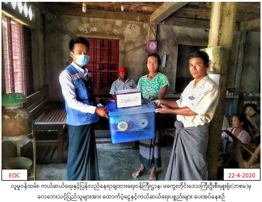 လူမှု၀န်ထမ်း၊ ကယ်ဆယ်ရေးနှင့်ပြန်လည်နေရာချထားရေး၀န်ကြီးဌာန၊ ဘေးအန္တရာယ်ဆိုင်ရာစီမံခန့်ခွဲမှုဦးစီးဌာန၊ မကွေးတိုင်းဒေသကြီးဦးစီးမှူးရုံးမှ တာဝန်ရှိသူများသည် မကွေးမြို့နယ်၊ မင်းရွာကျေးရွာအုပ်စု၊ သပွတ်ကျောကျေးရွာတွင် (၂၁-၄-၂၀၂၀) ရက်နေ့တွင် လေပြင်းတိုက်ခတ်မှုကြောင့် ပြိုကျအိမ်ခြေ(၁)လုံး၊ အမိုးလန်အိမ်ခြေ(၃)လုံးအတွက် အိမ်ဆောက်ပစ္စည်းဖိုး (၁၇၀၀၀၀ိ/-)ကျပ်၊ လူဦးရေ(၁၆)ဦးအတွက် ဆန်ရိက္ခာဖိုးငွေ(၃၃၆၀၀ိ/-)ကျပ်၊ စုစုပေါင်း(၂၀၃၆၀၀ိ/-)ကျပ်နှင့် ကယ်ဆယ်ရေးပစ္စည်း (၁၆)မျိုး အိမ်ထောင်စု(၁)စုစာတို့အား (၂၂-၄-၂၀၂၀) ရက်နေ့ (၁၁:၀၀)နာရီအချိန်တွင် အထွေထွေအုပ်ချုပ်ရေးဦးစီးဌာနမှ တာဝန်ရှိသူများနှင့်အတူ ဘေးသင့်ပြည်သူများလက်ဝယ်အရောက်ထောက်ပံ့ပေးအပ်ခဲ့ပါကြောင်း သတင်းရရှိပါသည်။