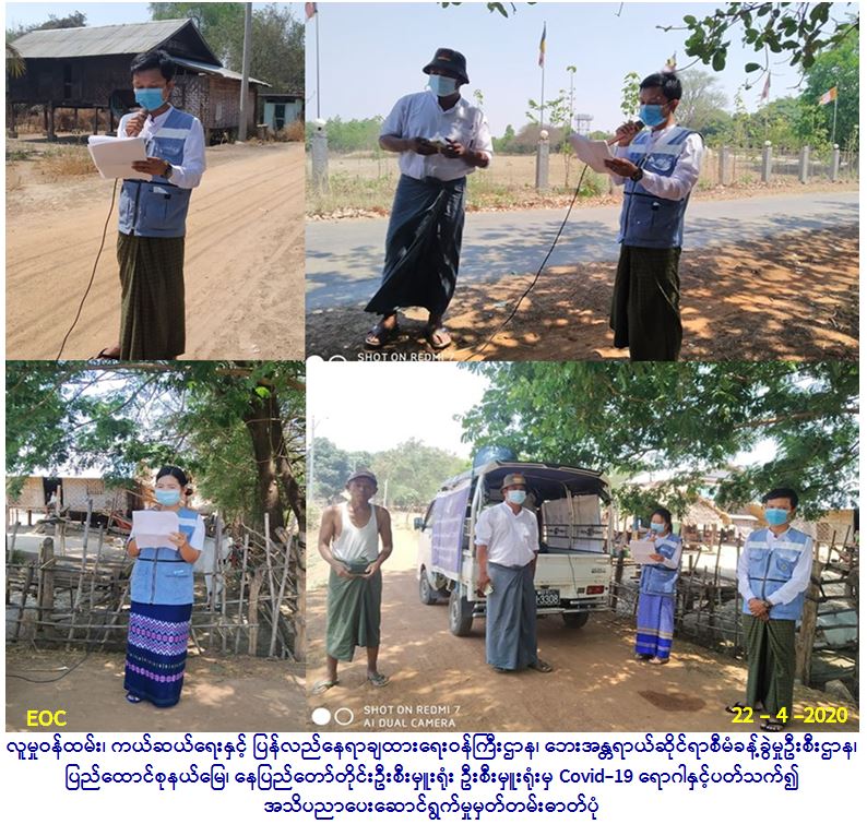 လူမှုဝန်ထမ်း၊ ကယ်ဆယ်ရေးနှင့် ပြန်လည်နေရာချထားရေးဝန်ကြီးဌာန၊ ဘေးအန္တရာယ်ဆိုင်ရာစီမံခန့်ခွဲမှုဦးစီးဌာန၊ ပြည်ထောင်စုနယ်မြေ၊ နေပြည်တော်တိုင်းဦးစီးမှူးရုံးမှ တာဝန်ရှိသူများသည် (၂၂-၄-၂၀၂၀) ရက်နေ့ နံနက် (၀၉:၃၀) အချိန်မှ ညနေ (၁၅:၄၀) အချိန်အထိ ပြည်သူများအား COVID-19 ရောဂါကူးစက်ပြန့်နှံ့မှုများ မဖြစ်ပွားစေရန်အတွက် သိရှိလိုက်နာ ဆောင်ရွက်ရမည့်အချက်များနှင့်ပတ်သက်၍ အသိပညာပေးခြင်းကို လယ်ဝေးမြို့နယ်၊ တည်ထောင်ကျေးရွာအုပ်စု၊ တည်ထောင်ကျေးရွာ၊ အင်တောသာကျေးရွာ၊ တဲစုကျေးရွာ၊ ကြံဖိုစုကျေးရွာ၊ စမ်းကြီးကျေးရွာ၊ ဥသျှစ်ကုန်းကျေးရွာနှင့် သော်မှော် ကုန်းကျေးရွာအုပ်စု၊ သော်မှော်ကုန်းကျေးရွာ၊ကျွန်းကုန်းကျေးရွာ၊ကံသာကျေးရွာများအတွင်းရှိ ပြည်သူများသို့ ထိရောက်စွာ လိုက်လံ အသိပေး ဆောင်ရွက်ခဲ့ပါကြောင်း သတင်းရရှိပါသည်။