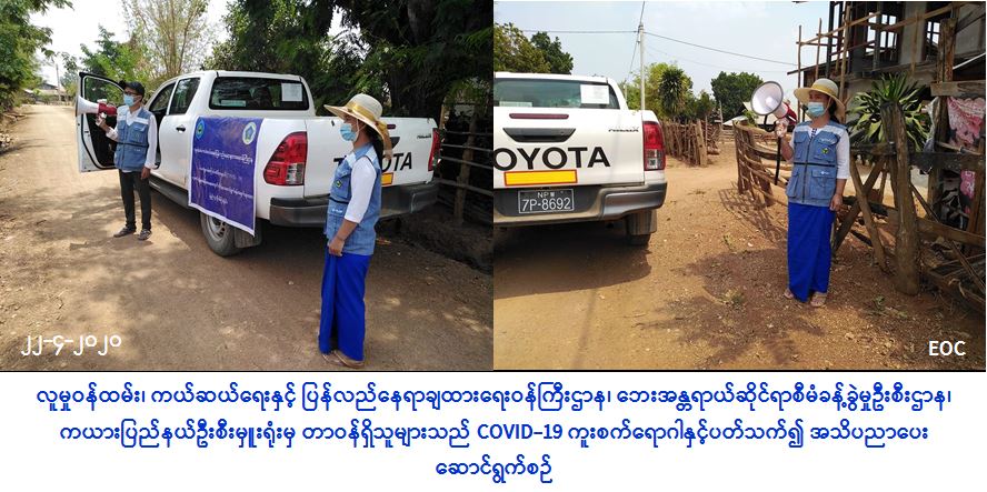 လူမှုဝန်ထမ်း၊ ကယ်ဆယ်ရေးနှင့် ပြန်လည်နေရာချထားရေးဝန်ကြီးဌာန၊ ဘေးအန္တရာယ်ဆိုင်ရာစီမံခန့်ခွဲမှုဦးစီးဌာန၊ ကယားပြည်နယ်ဦးစီးမှူးရုံးမှ တာဝန်ရှိသူများသည် (၂၂-၄-၂၀၂၀) ရက်နေ့တွင် လွိုင်ကော်မြို့နယ်၊ ချိကယ်ကျေးရွာအုပ်စု၊ ဒေါဆော်ဘီကျေးရွာနှင့် ဒေါမူကလားကျေးရွာများအတွင်း COVID-19 ရောဂါကူးစက်ပျံ့နှံ့မှုမဖြစ်ပွားစေရေးအတွက် သိရှိလိုက်နာရန်အချက်များအား အသိပညာပေးခြင်းများ ဆောင်ရွက်ခဲ့ကြောင်း သတင်းရရှိပါသည်။